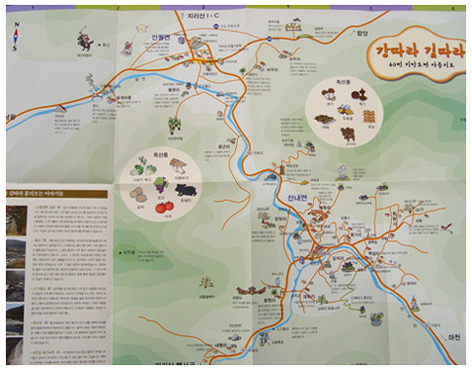 지리산권 마을 자체 지도 제작 -경남일보 생명연대·남원 인월면 공동제작 지리산권의 한 마을과 지리산을 지키는 시민단체가 자체적으로 지도를 만들어 화제가 되고있다. 남원시 인월면과 산내면, 함양군의 마천, 산청군 생초면으로 연결되는 60번 지방도 중 일부를 표시하고 있는 이 지도는 지리산 생명연대와 남원시 인월면이 공동으로 제작한 것으로 마을에서 나오는 자원과 지리산의 산길 등이 비교적 상세하게 나타나있다. 지리산 생명연대에 따르면 이 지도는 60번 지방도의 확포장 공사 저지를 기념해 만들어진 것으로 이 공사는 올해초 환경 파괴를 우려하는 시민단체와 인근 주민들의 반대로 무산된 바 있다. 지리산 생명연대의 한 관계자는 “담당 기관이 주체가 된 것이 아니라 시민단체와 마을 주민들이 공동으로 만든 지도는 거의 최초가 아닐까 한다”며 “빠른 길을 안내하는 여느 지도와는 달리 이 지도는 사람 냄새가 물씬 나는 길을 만들어가자는 취지로 제작된 것”이라고 말했다.