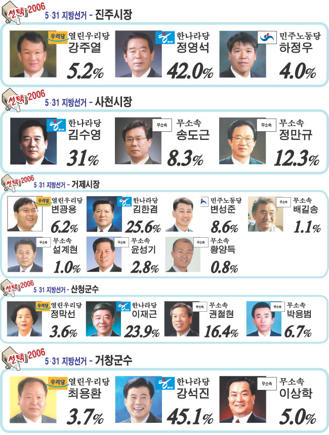산청군수 오차범위 내 접전(서부경남 여론조사) -경남신문 서부경남에서는 산청군수를 제외한 진주·사천·거제시장. 거창군수 선거에서 한나라당 후보가 전통적인 지지세를 바탕으로 당선 가능성이 높은 것으로 조사됐다. 경남신문이 여론조사 전문기관인 경남리서치에 의뢰하여 실시한 진주·사천·거제시장. 산청·거창군수 여론조사에서 산청군수 후보의 지지도는 한나라당 이재근 후보와 무소속인 권철현 후보가 오차범위 내에서 접전을 벌이는 것으로 나타났다. 진주시장은 지지 후보를 정하지 못한 부동층이 48.8%에 달한 가운데 한나라당 정영석 후보 42.0% . 열린우리당 강주열 후보 5.2% . 민주노동당 하정우 후보 4.0%로 정 후보가 2위를 한 강 후보보다 36.8%p 앞서고 있다. 당선 가능성도 정 후보가 53.7%로 강 후보 2.5% . 하 후보 1.0%보다 높았다. 사천시장은 48.4%가 지지후보를 정하지 못한 가운데 한나라당 김수영 후보 31.0% . 무소속 정만규 후보 12.3% . 송도근 후보 8.3% 순으로 나타났다. 당선 가능성은 김 후보가 32.1%로 2위를 한 정 후보 9.8%보다 22.3%p 높은 것으로 전망했다. 거제시장은 유권자의 53.9%가 부동층인 것으로 나타난 가운데 한나라당 김한겸 후보 25.6% . 민주노동당 변성준 후보 8.6% . 열린우리당 변광용 후보 6.2% . 무소속 윤성기 2.8% . 배길송 1.1% . 설계현 1.0% . 황양득 후보 0.8% 순으로 지지도를 기록했다. 당선 가능성은 김한겸 후보가 39.3%로 2위를 한 변성준 후보 3.6%보다 35.7%p 높았다. 산청군수는 49.3%가 아직 지지후보를 정하지 못한 채 한나라당 이재근 후보(23.9%)와 현 군수로 무소속으로 출마한 권철현 후보(16.4%)가 오차범위(7.9%p) 내에서 선두경쟁을 벌이고 있다. 무소속 박용범 후보는 6.7% . 열린우리당 정막선 후보는 3.6%의 지지도를 보였다. 당선 가능성은 이 후보가 29.3%로 권 후보 13.4%로 오차범위를 벗어난 15.9%p 높은 것으로 분석됐다. 거창군수는 46.2%가 지지후보를 정하지 못한 가운데 한나라당 강석진 후보 45.1% . 무소속 이상학 5.0% . 열린우리당 최용환 후보 3.7% 순으로 나타났다. 당선 가능성은 강 후보가 54.1%로 전망됐다. 이번 여론조사는 19·20일 양일간 실시됐고 표본오차는 95% 신뢰수준에서 ±3.76~4.17%p이다.