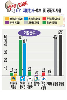 거창군수 여론조사 분석 -경남신문 강석진 전연령 고른 지지로 독주 거창군수 여론조사 결과. 한나라당 강석진 후보가 열린우리당 최용환 후보와 무소속 이상학 후보를 크게 앞서면서 부동층은 46.2%로 조사됐다. 한나라당 강 후보는 지지도 조사에서 45.1%를 얻어 무소속 이 후보(5.0%)와 열린우리당 최 후보(3.7%)에 대해 40.1%p와 41.4%p를 각각 앞서 오차범위(±3.93%)를 크게 벗어난 우위를 보였다. 강 후보의 이같은 지지도는 한나라당 정당 지지율인 40.1%를 5.0%p나 웃도는 수치다. 정당 지지율은 한나라당 40.1% . 민주노동당 3.5% . 열린우리당 3.2% . 민주당 0.3% . 기타 0.3%를 각각 보인 가운데 지지정당이 없거나 모름. 무응답 등 ‘무당층’도 52.5%나 됐다. 연령·직업별 지지도 조사에서도 한나라당 강 후보는 모든 계층에서 다른 후보를 압도한 가운데 연령에서는 50대 52.5% . 40대 50.8%로 자신의 평균을 웃돈 가운데 60대 이상 44.4% . 30대 36.5% . 20대 34.0% 등의 순으로 나타났다. 직업에서는 자영업 51.3% . 블루칼라 48.3% . 주부 42.6% . 기타·무직·무응답 39.3% . 화이트칼라 37.6%로 조사됐다. 무소속 이상학 후보는 50대에서 15.3% . 자영업에서 9.9%로 자신의 평균을 상회하면서 30대 4.8% . 주부 5.0% 등으로 각각 나타났다. 열린우리당 최용환 후보는 30대 7.7% . 40대 7.3% . 화이트칼라 8.2%로 평균 지지율을 웃돌았다. 당선가능성에서도 한나라당 강 후보가 54.1%로 무소속 이상학 후보 1.4% . 열린우리당 최용환 후보 1.1%로 각각 나타나 크게 앞섰다. 투표 참여를 묻는 질문에서는 “적극 참여” 82.6% . “가능하면 참여” 8.5%로 ‘참여하겠다’로 해석되는 응답자가 전체 91.1%로 조사됐다.