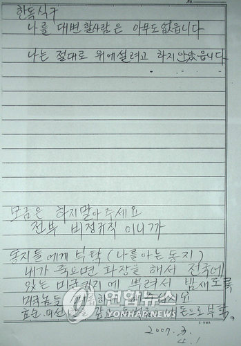 <"숨진 허씨 `날 위해 모금하지 말라'">(종합) -연합뉴스 숨진 허씨 `날 위해 모금하지 말라 (서울=연합뉴스) 전성훈기자 = `한미FTA 무효 민중민주 노동열사 허세욱 동지 장례대책위원회'는 한미FTA 협상 반대를 외치며 지난 1일 서울 한남동 하얏트 호텔에서 분신을 시도한 뒤 2주 만인 15일 숨진 허세욱씨가 직장 동료들에게 남긴 유서를 공개했다. (서울=연합뉴스) 임은진 기자 = 지난 1일 한미 FTA(자유무역협정) 협상장 근처에서 분신을 시도한 뒤 2주 만인 15일 숨진 허세욱(54)씨가 직장 동료들에 대한 애정을 담아 작성한 유서가 공개됐다. 15일 `한미FTA 무효 민중민주 노동열사 허세욱 동지 장례대책위원회'가 공개한 유서에 따르면 허씨는 자신이 일하던 서울 H운수의 동료들에게 "모금은 하지 말아주세요. 전부 비정규직이니까"라고 당부했다. 동료들이 넉넉하지 않게 생활하고 있다는 점을 누구보다도 잘 알던 허씨가 직장 친구들에게 남긴 마지막 배려로 보인다. 그는 "내가 죽으면 화장을 해서 전국의 미군기지에 뿌려서 밤새도록 미국 놈들 괴롭히게 해주십시오. 효순ㆍ미순 한(恨) 갚고 (미군 기지에 유해를 뿌려서 내게 될) 벌금은 내 돈으로 부탁한다"고 적었다. 대책위는 "허씨가 민노총과 서울 H운수, 가족에 각각 1장씩 유서를 남긴 것으로 안다"고 말했다. 허씨는 평소 한미FTA 반대 활동에 적극 참여해 왔던 것으로 알려졌다. 참여연대 회원이었던 허씨는 지난달 29일 청와대 앞에서 한미FTA 협상 중단을 요구하며 몸에 피켓을 메고 1인 시위를 벌였다. 16년간 택시운전사로 일하며 독신으로 살아온 그는 회사에서 노조 대의원으로 오랫동안 일했으며 민주노동당 당원과 민주노총 조합원 등으로 활동했다. 정기열 민주택시노조 조직부장은 이날 "허씨는 택시 일뿐만 아니라 사회 운동에도 열심히 참여했다"며 "대통령 탄핵반대 촛불집회, 효순이ㆍ미순이 추모집회 등에 참가하는 등 자신의 의견을 표현할 줄 아는 사람이었다"고 회고했다. 정 부장은 "한미FTA와 관련한 신문 기사를 꾸준히 스크랩해 공부 했으며 자신의 택시를 이용하는 승객들에게 FTA 반대 전단지를 나눠주기도 했다"고 전했다. 허씨는 한미FTA 막바지 협상이 진행되던 지난 1일 서울 한남동 하얏트 호텔 앞에서 분신을 시도해 전신 3도 화상을 입은 뒤 서울 영등포구 한강성심병원으로 옮겨져 지난 4일 피부이식 수술을 받았으나 15일 오전 11시23분께 끝내 숨졌다.
