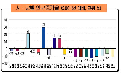 김해시 ‘빅뱅’ 곧 최대 도시 부상 -경남매일 6월말 김해인구 45만9천여 명, 10년 새 1.5배 팽창 도, 주민등록인구 발표… 양산·거제·진해도 증가 노인 인구 66.6%나 급증… 비율도 10.9%로 확대 김해시 인구가 10년 새 50.8%나 가파르게 증가해 빅뱅현상을 보이고 있다. 김해 인구는 6월말 현재 45만9,460명으로 10년 전인 1997년 상반기 30만7,204명보다 15만2,250여명이 늘어 1.5배로 팽창했다. 김해시는 도내 20개 시·군 가운데 인구가 가장 많은 창원시의 50만4,348명에 이어 2위를 기록했고 3위인 마산시 41만8,674명보다는 4만여 명이 많다. 게다가 김해시는 2001년 이후 한해 평균 30%씩 증가하데 비해 창원은 4%씩 감소추세를 나타내고 장유 율하 지구 입주가 완료되면 2~3년 내 경남 최대 도시로 부상할 전망이다. 경남도가 27일 발표한 올해 6월말 주민등록인구는 317만9,085명으로 1997년 304만3,758명보다 10년 새 13만5,327명이 증가한 것으로 나타났다. 특히 공단조성과 신항만 등 개발붐이 일고 있는 양산시는 6월말 현재 22만9,003명으로 10년 새 32.4% 불었고 거제시 24.4%(20만4,894명), 진해시는 21.7%(16만2,415명)가 늘었다. 또 사천시는 인구 11만2,605명으로 밀양시의 11만1,659명을 추월했고 마산시와 인접한 함안군도 6만4,460명으로 거창군의 6만3,778명을 앞질렀다. 반면 도내서 인구가 가장 적은 의령군은 3만795명, 다음이 산청군 3만5,426명이고 함안군을 제외한 나머지 9개 군은 감소추세를 기록했다. 이와 함께 핵가족 현상과 고령화도 갈수록 두드러지고 있다. 도내 세대수는 1997년에 93만6,529세대에서 올해는 116만6,458세대로 10년 새 23만여 세 대 늘었다. 세대당 가족수는 3.27명에서 2.73명으로 줄었다. 65세 이상 노인인구는 같은 기간의 23만1,000명에서 34만6,000명으로 11만5,000명(66.6%) 늘었고, 노인인구 비율도 7.6%에서 10.9%로 확대됐다. 노인인구비율이 20%이상인 초고령지역은 의령(29.0%), 남해(28.7%), 합천(28.6%) 등 9개 군이고 고령인구가 7%에 못 미치는 비교적 젊은 도시는 김해(6.5%)와 창원(5.0%)시 등 2개시에 불과했다. 평균연령은 31.4세에서 10년 만에 36.2세로 높아졌다. 또 도내 여성 인구 100명당 남성인구는 100.9명으로 계속해서 남성이 여성보다 많은 것으로 나타났다. 경남지역 외국인은 6월말 현재 3만9,330명으로 총인구의 1%를 넘어서는 등 증가세를 보이고 있다.