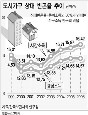 국민 5명 중 1명은 '빈곤자' -국제신문 작년 도시가구 상대빈곤율 16%…소득 양극화 심화 소득분배 용역보고서 도시가구의 16%가 상대적인 빈곤상태에 빠져 있는 것으로 나타났다. 이 같은 수치는 통계 작성이 시작된 지난 1999년 이후 최고 수준으로 소득 양극화 현상이 심화되고 있음을 의미한다. 국민 5.4명 중 1명은 상대적 빈곤 한국보건사회연구원과 한국노동연구원은 최근 기획예산처 양극화·민생대책본부에 '소득분배 및 공적이전·조세의 재분배' 용역보고서를 제출했다고 1일 밝혔다. 보고서에 따르면 지난해 도시가구의 시장소득 기준 상대빈곤율(중위소득의 50%가 안 되는 가구의 소속 인구 비율)은 16.42%로 전년의 15.97%에 비해 0.45%포인트 올라갔다. 시장소득은 경상소득에서 공적이전소득(정부보조 등)을 제외한 것으로 가구원이 시장에서 벌어들인 소득을 말한다. 경상소득에서 직접세와 사회보장부담금을 제외한 가처분소득으로 봐도 상대빈곤율은 작년에 14.59%로 1999년의 14.52%를 넘어 최고치를 기록했다. 전국가구의 상대빈곤율은 시장소득 기준 18.45%, 경상소득 기준 16.51%, 가처분소득 기준 16.43%였다. 국민 5.4명 중 1명은 상대적 빈곤에 빠져 있는 셈이다. 정부보조를 소득으로 인정한 가처분소득 기준으로 보더라도 6명 중 1명은 빈곤자에 해당된다. 상위 10% 소득이 하위 10%의 24배 도시가구를 소득에 따라 5개 그룹으로 분류했을 경우, 상위 20%의 소득을 하위 20%의 소득으로 나눈 5분위 배율도 외환위기 당시보다 높아졌다. 작년에 시장소득 기준 5분위 배율은 6.95배로 전년의 6.77배보다 높아졌다. 연도별로는 1999년 6.80배, 2000년 6.03배, 2001년 6.30배, 2002년 6.17배, 2003년 6.41배, 2004년 6.61배 등이다. 시장소득 10분위 배율도 작년에 15.77배로 전년의 15.58배와 1999년의 15.16배보다 높아 역시 최고 기록을 세웠다. 전국가구 기준으로 10분위 배율은 시장소득 23.89배, 경상소득 14.22배, 가처분소득 15.27배였다. 시장소득의 경우 최상위 10%의 소득이 최하위 10%의 24배나 된다는 뜻이다.