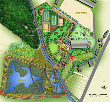 산청 장승배기 생태공원 조성 -경남일보 양전리 일원 탐방학습·학습휴양시설 등 산청군은 신등면 양전리 일대에 탐방시설과 체육시설 등을 갖추 장승배기 생태공원 사업을 추진한다. 이를 위해 군은 19일 신등면사무소 회의실에서 기관단체장과, 주민 등 60여명이 참석한 가운데 ‘장승배기 생태공원 조성사업’ 착수를 위한 주민설명회를 가졌다. 설명회에서 군은 조성계획 최종결정에 앞서 그간 부지보상, 사업설계를 비롯한 행정절차 등 구체적인 사업 추진상황을 설명하고 지역주민들의 의견을 수렴하는 시간을 가졌다. 장승배기 생태공원엔 양전소류지를 활용한 연꽃단지, 수생초화원, 산책로 등 탐방학습시설과 지역주민과 학생이 함께 이용할 수 있는 테니스장, 게이트볼장, 족구장 등 체육시설, 야외갤러리, 야외교실, 피크닉장 등 학습휴양시설이 조성된다. ▲사진설명=산청 장승배기 생태공원 조감도