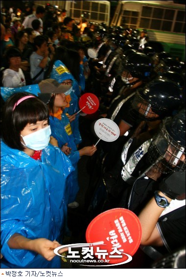 시위현장에 '바람' 몰고 온 '우비소녀' -국제신문 10대들이 전경에게 보내는 따뜻한 부채질 "똑같이 덥잖아요. 저희들도 더운데 전경 오빠들은 얼마나 덥겠어요. 아무 죄도 없는데..." 정아(19.여.고3)양은 말끝을 흐렸다. 그러면서도 '전경 오빠'들에게 해주던 부채질을 멈추지 않았다. 전경들도 싫지 않은 표정이다. 얼굴 전체를 가리고 있는 진압모 쇠철망 사이로 앳된 얼굴이 부끄러움을 탔다. 최근 격렬해지고 있는 미국산 쇠고기 수입 반대 촛불집회에 맞서 경찰이 물대포에 최루액을 섞겠다고 밝힌 27일에도 51번째 촛불집회가 열렸다. 이날 경찰은 전경버스로 차벽을 쌓는 대신 최전방에 진압복을 갖춰 입은 전경들을 배치했다. 진압모에 마스크, 온몸을 감싸 돌아 목까지 올라온 두꺼운 진압복을 갖춰 입고 손에 방패까지 든 전경들은 긴장을 감추려는 듯 대치한 시민들과 눈조차 마주치려 하지 않았다. 이들 앞에 '파란 요정'들이 나섰다. 물대포에 대비해 파란 비닐 우의를 입고 나온 10대 청소년들을 두고 하는 말이다. 자칭 '10대 연합'이다. 서울과 경기도에 있는 남녀 중고등학생들이 개인적인 고민을 나누고 촛불집회 같은 사회 문제도 함께 이야기하기 위해 자율적으로 만든 모임이란다. 전경과 마주한 '파란 요정'들은 10명 안팎이었다. 일렬로 선 이들의 부채질에 '혜택(?)을 보는 전경도 그만큼 만이었다. 그러나 이들은 2시간이 넘도록 '전경 오빠'들에게 손바람을 불어주고 있었다. 얼굴과 목, 손 등에 골고루 바람을 실어 날랐다. 전경들 이마에서 주르륵 땀이 흐르면 "어떡해~ 덥죠 오빠!"하며 더 세게 부채를 부쳤다. 같은 시간 '파란 요정'들 오른쪽엔 이날도 예닐곱 명의 국회의원들이 '국민보호대'를 자청하며 나와 있었다. 왼쪽엔 코리아나 호텔 유리창을 향해 일부 과격한 시민들이 날달걀을 던지고 있었다. 하지만 '파란 요정'들은 오로지 부채질에 열중했다. 부치다 왼팔이 아프면 오른팔로 바꿔 부쳤다. 다시 왼팔로 옮기더니 아예 두 손으로 부채를 쥐고 끝까지 바람을 멈추지 않았다. 이를 지켜보고 있던 한 40대 남성이 "너희들 이거 누가 시켜서 한 거야"라고 물었다. "아니에요, 그냥 우리끼리 하는 거예요." 돌아오는 대답은 간단했다. 옆에 있던 사람들이 "그럼, 그럼. 누가 시켜서 저렇게 하겠어?"라며 맞장구쳤다. 또 한 남성은 "전경들은 좋겠다. 나 군대 있을 땐 이런 (부채질하는) 거 없었는데"라고 시샘도 냈다. 학생들 대부분은 기말고사 기간이었다. "시험 기간인데 공부 안 하고 이렇게 나와도 되나요?"라고 묻자 재호(18.고2)군은 "시험 기간에는 일찍 끝나잖아요. 시험 기간이라 나왔어요" 하고 대답했다. 동문서답 같지만 우문현답이었다. 방패와 물대포가 기다리고 있는 가장 '살벌한' 최전방에서 이날 '파란 요정'들의 작은 부채질은 그동안 집회 참가자들이 몸으로 보여준 어떤 행동보다 아름다워 보였다.