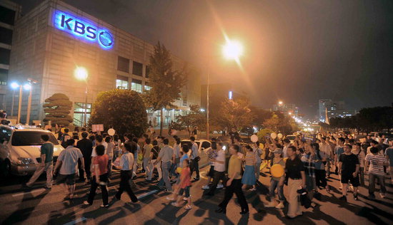 5일 촛불문화제 6·10 이후 최대 -도민일보 주최 측 추산 50만 명 모여…경남은 창원, 마산, 진주 등 13개 시군서 촛불 들어 5일 오후 창원시 정우상가 앞에서 광우병 쇠고기 수입반대 촛불문화제가 열렸다. 이날 문화제를 마친 시민들이 이명박 정부를 규탄하고 공영방송을 지켜내자는 구호를 외치며 KBS 창원총국 앞으로 들어서고 있다. /박일호 기자 iris15@ 촛불의 위세는 여전했다. 토요일인 지난 5일 서울에서 열린 촛불문화제에는 주최 측 추산으로 50만 명(경찰 추산 5만 명)이 모이는 등 '6·10 100만 촛불 대행진' 이후 최대 규모로 진행됐다. 지난달 30일 천주교정의구현전국사제단의 시국 미사 이후 종교계가 적극적으로 참여하면서 비폭력 기조도 다시 정착됐다. 그래서 이날 경찰과 촛불 시위자들의 충돌은 없었다. 하지만, 촛불 참가자들의 '오로지 재협상' 요구와 정부의 '재협상 불가' 방침이 여전히 첨예하게 맞서고 있어 촛불 정국의 끝은 아직 보이지 않는다. 이날 오후 6시 서울시청 앞 광장에서 시작한 촛불문화제는 다음 날 오전까지 이어졌다. 이날 광우병 국민대책위는 △미국산 쇠고기 수입 전면 재협상하고 △재협상이 이루어질 때까지 현재 유통되고 있는 미국산 쇠고기를 모두 회수하며 △비이성적 경찰폭력과 반민주적 공안탄압, 언론통제와 누리꾼 탄압을 중단하고 △의료민영화, 방송장악음모, 교육의 공공성 포기, 한반도 대운하, 공기업 민영화, 고환율 정책 등을 중단하며 △시민사회단체·종교계 대표들과 대통령의 면담, 대국민 공개토론회를 개최하라는 등 5개 요구 사항을 발표했다. 광우병 국민대책위는 또 '국민승리 선언문'을 통해 "국민의 건강 문제는 지쳤다고 중단할 사안이 아니고 정부가 안 듣는다고 멈춰서는 안 된다"며 "나와 내 아이의 건강을 포기할 수 없는 것처럼 재협상을 향한 촛불저항은 절대 끝낼 수 없다"고 밝혔다. 경남에서도 이날 창원, 마산, 진주 등 13개 시군에서 촛불을 들었다. 5일 오후 7시 30분 창원 정우상가 앞에서 열린 촛불문화제에는 600여 명이 참가했다. 지난달 10일 이후 최대 인원이다. 특히 이날 금속노조 현대로템지회 조합원 100명이 참석하는 등 조직적인 참가자가 많았다. 이날 자유발언에 나선 노동자 전창현 씨는 경남에서도 종교단체가 주최해 촛불 시국 미사를 열자고 제안했다. 또 창원 동읍에 사는 강종철 씨는 오랜 촛불문화제로 모두 피곤하지만, 이명박 대통령이 청와대를 지키는 한 우리도 촛불을 끌 수가 없다고 말했다. 촛불문화제를 마친 후 참석자 200여 명은 거리 행진으로 창원 상남동을 한 바퀴 돈 후 KBS 창원 방송국 앞에서 자진 해산했다.