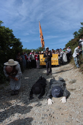 스님·신부 함께 ‘오체투지’ 순례 -경남신문 수경 스님·문규현 신부, 지리산~계룡산 200㎞ 길 떠나 지난 4일 오체투지 순례길에 오른 수경 스님과 문규현 신부가 지리산 노고단 길을 통해 성삼재 휴게소로 내려오고 있다. “우리는 직업과 믿음, 신분, 남녀노소를 구분하지 않고, 평화로운 세상을 염원하는 작은 진리들과 연대를 하겠습니다. 군들의 아픔을 함께 아파하며 희망의 길을 찾아가는 순례의 길을 만들고자 합니다.” 지난 4일 오후 3시 해발 1507m의 지리산 노고단에서 두 손과 두 다리, 그리고 이마를 땅에 대고 절을 하며 나아가는 ‘오체투지 순례’를 시작한 불교환경연대 상임대표인 수경 스님과 천주교정의구현사제단 문규현 신부가 11일 7일째 순례를 이어갔다. 차량이 빈번하게 다니는 길이다보니 안전상의 문제도 따른다. 그래서 일부 구간에서는 오체투지가 아니라 ‘삼보 후 반절’ 형식으로 순례를 진행했다. 300m를 나아간 뒤 10분 휴식을 갖고 다시 300m를 진행하는 방식으로 하루 약 4km 안팎을 순례하고 있는 두 순례자는 구례와 남원, 임실, 완주, 전주, 논산, 공주를 거쳐 목적지인 계룡산 신원사에는 약 두 달 뒤인 11월 1일 도착할 것으로 예상된다. 전체 거리는 약 200km에 이른다. 두 성직자는 지난 2003년 3월에는 새만금 사업 재개를 반대하며 전북 부안에서 서울까지 310km 구간을 삼보일배로 순례했으며, 특히 수경 스님은 지난 2월 17일부터 103일간 각 종교 관계자들과 한반도 대운하를 반대하며 4대 강을 따라 1300km 구간을 도보로 순례하기도 했다.