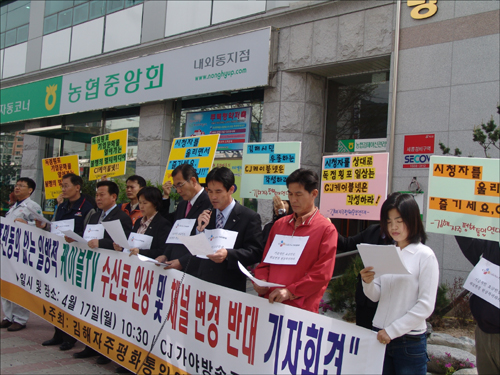 CJ가야방송 수신료인상·채널변경 반발 확산 -경남일보 속보=가야방송 체널변경 시민반발 확산(본지 4월1일자 7면 보도)관련, 지역자치회와 시민단체가 수신료인상과 채널변경에 항의하며 반발이 확산되고 있다. 김해지역의 시민단체로 구성된 김해자주평화통일연대는 17일 오전 시내 내외동 CJ가야방송국 앞에서 기자회견을 갖은 뒤 방송국을 방문, "CJ가야방송은 기습적인 수신료 인상을 즉각 철회하라" 며 시민요구를 담은 서한문을 전달했다. 김해자주평화통일연대는 이날 서한문 전달에 앞서 벌인 기자회견에서 "CJ가야방송이 더좋은 서비스제공을 위해 재원마련을 위한 명분으로 시민들의 동의도 없이 기습적으로 채널을 변경하고 요금을 인상시켜 시민들의 호주머니를 털고 있다"며 "기습적으로 인상한 요금을 인하해야 한다"고 촉구했다. 이후 이들은 이날 CJ가야방송을 방문하고 ▲기습적으로 인상된 요금인하 ▲변경된 체널 원상복구 ▲공청회를 통한 시민 공감대형성 등이 담긴 김해시민 요구서를 전달했다. 시민단체들로 부터 시민요구서를 전달받은 CJ가야방송 박성국 마케팅팀 팀장은 "이번 사안에 대해 시민들이 알고 있는 입장과는 큰 차이가 있다"면서 "그러나 올해는 요금인상을 한 적이 없은데 요금을 인하하려는 것은 잘못 이해한 것이며 시민과의 공개토론회 요구에 대해서는 상급부서에 보고해 토론회 개최를 위한 자리를 마련해 보겠다"고 밝혔다. ▲사진설명=김해자주평화통일연대가 17일 CJ가야방송국을 방문 김해시민 요구서가 담긴 서한문을 전달하고 있다.
