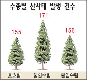 산사태 예방 조림 '양보단 질' -국제신문 산림청 조사… 나무 빽빽한 지역 자주 발생 간벌로 줄기·뿌리 튼튼해져야 방지효과 커 산에 나무가 너무 많아도 탈이다. 나무가 빽빽한 산이 그렇지 않은 곳보다 산사태가 자주 발생하기 때문이다. 나무가 빼곡하면 나무들이 생장에 필요한 태양 수분 양분을 서로 먼저 흡수하려고 경쟁을 벌이면서 전체적으로 줄기가 가늘어지고 뿌리도 토양 깊이 자리잡지 못한다. 반면 간벌 등 숲 가꾸기를 통해 나무를 적당히 솎아낸 곳의 나무는 줄기가 굵고 뿌리가 튼튼해 토양을 잘 지킨다는 것이다. 산림청은 최근 집중호우에 따른 산사태 발생 현황과 산림 밀식도의 상관관계를 조사한 결과 나무의 밀도가 41~70% 정도의 산이 조밀한 곳보다 산사태 발생이 훨씬 적은 것으로 나타났다고 26일 밝혔다. 산림청은 2002년 태풍 루사, 2003년 매미, 올해 에위니아 등으로 인한 산사태 발생자료를 토대로 분석했다. 나무 굵기에 따른 산사태 발생 빈도는 줄기 평균 지름이 6㎝ 이하인 산림지역에서 230건이 발생한 데 비해 8~16㎝에선 145건, 18~28㎝ 지역은 83건에 불과했다. 나무 굵기가 30㎝ 이상 되는 곳에서는 단 한 차례도 산사태가 일어나지 않은 것으로 조사됐다. 이 같은 결과는 산사태 발생이 나무의 많고 적음의 문제가 아니라 나무가 얼마나 크고 튼튼하냐에 달려 있다는 것을 보여주고 있다고 산림청은 설명했다. 15년생 잣나무를 상대로 솎아베기 효과를 분석한 자료에서는 솎아베기를 해준 나무는 10년이 지난 뒤 지름이 7㎝로 넓어졌으나 그렇지 않은 곳은 2.5㎝ 정도에 그쳤다. 산림의 수종은 침엽수와 활엽수가 적당히 섞여있는 상태가 산사태를 막는 데는 가장 좋은 것으로 밝혀졌다. 나무의 많고 적음을 무시한 산림 조건별 산사태 발생 빈도 조사에서 침엽수림과 활엽수림이 적당히 섞여 있는 혼효림에서는 1000㏊당 155건의 산사태가 발생한 데 비해 침엽수림 지역은 171건, 활엽수림 지역은 156건이 발생했다. 산림청 함양국유림관리사무소 허광수 소장은 "나무의 굵은 뿌리가 암반층까지 침투, 말뚝같은 역할을 하는 '말뚝효과'와 나무의 가는 뿌리들이 서로 얽혀 그물망을 형성, 흙이 쉽게 움직이지 못하게 하는 '그물효과'가 산사태를 막는 주요 기능"이라며 "적당한 간벌 등 숲 가꾸기를 통해 건강한 숲을 조성하는 것이 산림의 경제성을 높이고 풍수해 예방에도 가장 효과적"이라고 말했다. 한편 경남도 내에서는 창원 지계산, 진주 봉곡산, 함안군 강명산, 거창 봉계산 등 14곳이 산사태 다발지역으로 꼽히고 있다. 특히 올 장마에 따른 폭우로 거창군 20개소, 함양군 26개소에서 산사태와 임도 시설이 유실돼 72억여 원의 재산피해를 낸 것으로 집계됐다.