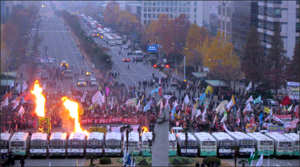"FTA 반대 도·의회 동참하라" -경남일보 도민운동본부 창원서 총궐기…큰 충돌은 없어 민주노총을 비롯 전교조 등이 전국 13개 도시에서 한미 FTA저지 동시다발집회와 관련, 한미 FTA저지 경남도민 운동본부도 22일 오후 1시 창원시청 앞 광장에서 농민과 노동자 등 1만여명(경찰추산)이 참석한 가운데 ‘노동법 개악저지, 사회양극화 해소 한미 FTA저지를 위한 도민 총궐기 대회’를 가졌다. 이날 한미 FTA저지 경남도민 운동본부 이병하 공동대표는 결의문을 통해 “정부는 우리나라 경제를 팔아먹는 졸속, 굴욕적인 한미 FTA협상을 즉각 중단하라”며 “경남도지사와 도의회는 이에 동참해 협상중단 대정부 건의문과 결의문을 채택할 것”을 촉구했다. 또 강기갑 의원(민주노동당)은 “국회는 서민경제를 파탄으로 몰아넣는 한미 FTA를 저지해야하는데도 서민을 외면한 채 정쟁만 일삼고 있다”고 비난한 뒤 “민노당이 FTA를 저지하는데 적극 앞장서겠다”고 밝혔다. 민주노총 경남본부 관계자는 “권력과 자본의 탐욕에 맞서 총파업이라는 어려운 선택을 할 수밖에 없었다”며 “총파업을 통해 노동자의 기본권을 침해하는 노동법 개악안을 저지해 노동자의 건강권과 생존권을 보장받을 것”이라고 밝혔다. 또 민노총 관계자는 “이날 오전10시부터 1일 전면총파업에 돌입한 뒤 단위 사업장별로 총파업 출정식을 갖고 23일, 24일, 27일, 28일 4일 동안 오후1시부터 4시간 동안 부분파업에 돌입하고 매일 오후4시 권역별 총파업투쟁 승리 결의대회를 갖는 등 지역별 총파업을 벌여 나갈 것”이라고 말했다. 이날 총궐기대회를 마친 농민과 노동자 1만여 명은 도청 앞까지 1.3㎞가량 가두행진을 벌인 후 도청 안으로 들어가려다 이를 저지하는 경찰과 충돌을 하기도 했으나 큰 물리적 마찰은 빚어지지 않았고 안으로 들어간 3000여명 시위대는 도청 청사 앞 주차장에서 ‘한미 FTA저지 반대 촛불 문화제’집회를 가진 뒤 오후 7시께 해산했다. 한편 이날 경찰은 행사장 주변에 15개 중대 1500여명의 진압, 경비인력을 배치했으며 도청까지 행진 등으로 인해 시내 도로 전체가 극심한 정체가 빚어졌다. ▲사진설명=한미 FTA저지 경남도민운동본부는 22일 오후1시 창원시청 앞 광장에서 1만여 명이 참석한 가운데 한미 FTA저지 도민총궐기 대회를 갖고 경남도청까지 거리행진을 벌이고 있다.