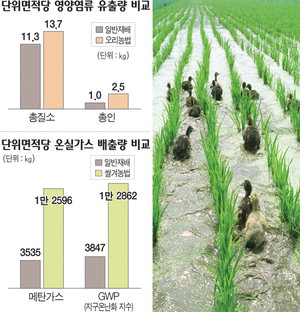 친환경 농법이 되레 환경오염 -국제신문 오리농법 수질 악화… 쌀겨농법은 온실가스 3배 배출 영남농업연구소 실태조사 친환경 농법의 대명사로 알려진 오리농법과 쌀겨농법도 수질오염과 온실가스 과다배출 등 환경오염 문제가 큰 것으로 나타났다. 이에 따라 친환경 농법의 정착을 위해선 정밀한 연구와 보완 대책이 시급하다는 지적이 제기됐다. 경남 밀양 소재 농촌진흥청 작물과학원 영남농업연구소는 오리농법이 적용된 논의 영양염류 실태를 조사한 결과 일반적인 농법보다 수질오염에 영향을 주는 총질소와 총인 함량이 높은 것으로 확인됐다고 10일 밝혔다 이 연구소는 지난해 벼 생육기인 6월부터 9월까지 울산시 울주군 오리농법 벼 재배단지를 조사했다. 그 결과 오리를 300평당 30마리를 방사한 논에서 단위면적(㏊)당 총질소(T-N)는 13.7㎏, 총인(T-P)은 2.5㎏이 유출됐다. 연구소 측은 "이는 적당한 비료와 농약을 살포하는 관행적인 벼 재배법(일반재배)과 비교했을 때 총질소는 1.2배, 총인은 2.5배가량 높은 수치"라며 "오리 배설물이 물의 이동에 따라 주변 하천으로 유출되면 수질을 악화시키는 영양염류로 작용할 수 있다"고 설명했다. 쌀겨농법은 온실가스 배출이 심한 것으로 조사됐다. 지난해 토양비료학회를 통해 발표된 시험결과에 따르면 논 10a(300평)에 질소·인산·칼리 비료를 각각 11㎏, 4.5㎏, 5.7㎏ 투입하는 표준재배는 벼 생육기간 중 온실가스 배출량이 ㏊당 3847㎏이었다. 반면 쌀겨 130㎏을 주었을 때 온실가스 배출량은 1만2862㎏으로 3배 이상 높았다. 온실가스 중에서도 메탄가스(CH4) 발생량이 많았다. 메탄가스는 각종 유기물질이 분해 되면서 나오는 기체로 지구온난화에 영향을 주기 때문에 세계적으로 배출량 저감 노력이 진행되고 있다. 두 연구를 진행한 작물과학원 고지연 연구사는 "그동안 친환경 농법의 농산물 안전 생산에 관한 연구는 많았지만 수질이나 대기환경에 미치는 영향에 대한 연구는 미미했다"며 "친환경 농법 정착을 위해서라도 개선책을 찾는 것이 중요하다"고 말했다. 고 연구사는 오리농법의 수질오염에 대한 대안으로 저습지 등 완충지대를 확보하는 방안을 제시했다. 그는 "오리농법 적용단지 하류에 수생식물이 잘 발달한 습지가 있을 경우 습지면적이 논의 약 6%만 되어도 유출된 질소와 인을 80% 이상 흡수해 수질이 정화됐다"며 "농업생태계 보전 차원에서 쌀겨농법 등에 대한 연구도 계속될 것"이라고 덧붙였다. # 오리농법, 쌀겨농법이란 오리농법은 모내기를 한 뒤 오리를 풀어 잡초제거와 병충해 방제 효과를 높이는 것으로 오리 배설물의 화학비료 대체효과도 높은 편이다. 쌀겨농법은 논을 갈기 전 쌀겨를 뿌려 지력 증진과 잡초 억제를 꾀하는 방법이다.