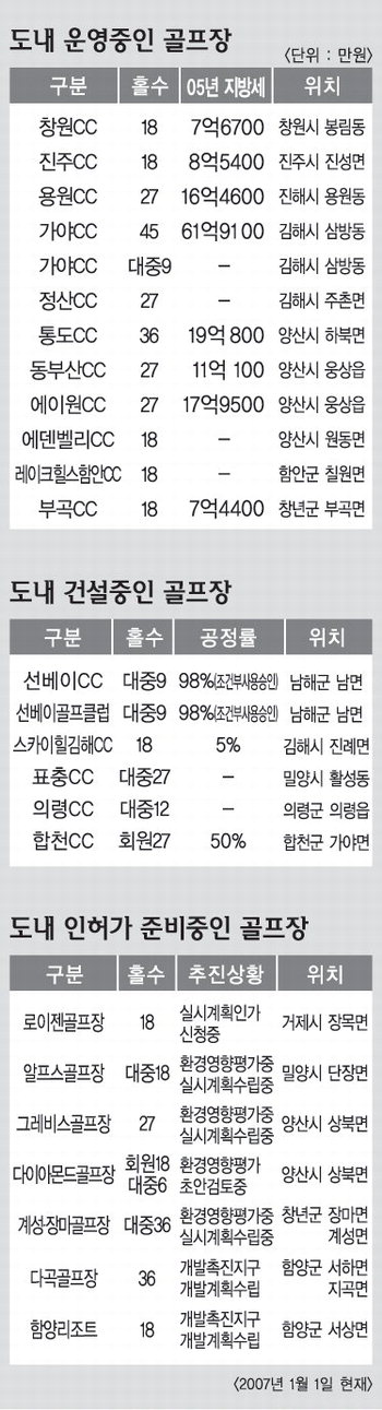 골프장, 지역경제 기여도 낮다 -도민일보 18홀 규모 지방세 납부액 7∼8억대 불과 지방자치단체들이 앞 다퉈 유치하고 있는 골프장은 과연 '황금알을 낳은 거위'일까? 최근 경남도내 지자체들 마다 지방세 수입 증대, 관광객 유치, 지역경제 활성화 등 듣기 좋은 구호를 내세워 주민들의 반대를 무릅쓰고 골프장 조성에 나서고 있지만 실상은 기대이하인 것으로 드러났다. 경남도가 민주노동당 김해연(거제2) 도의원에게 제출한 자료에 따르면 현재 도내에서 운영중인 골프장은 회원제골프장 11개소와 대중골프장1개소 등 모두 12개소다. 또 현재 건설 중인 골프장은 지난해 11월 조건부 사용승인(클럽하우스 미준공)을 받아 개장했다가 최근 편법영업으로 물의를 빚고 있는 남해 선베이CC와 선베이골프클럽 등을 포함해 6개소이며 골프장 건설을 위해 인허가를 준비 중인 곳도 7개소가 있는 것으로 집계됐다. 하루 이용자 600명 채 안되는 곳도 있어 이 가운데 이미 개장해 영업 중인 골프장의 지방세 납부 내역과 이용자 수 등을 살펴보면 '지방세 수입증대에 큰 도움이 된다' · '관광객 유치와 지역경제 활성화에 크게 기여한다'는 지방자치단체의 선전과는 거리가 멀다. 18홀 규모인 창원CC의 경우 2004년 7억9700여만 원, 2005년 7억6700여만 원의 지방세를 내는데 그쳤다. 같은 규모인 진주CC도 2004년 10억5200여만 원, 2005년 8억5400만원을 납부했을 뿐이다. 27홀 규모인 진해 용원CC는 2004년 17억600여만 원, 2005년 16억4600여 만 원 지방세를 냈다. 김해 가야CC는 2004년 30억5100여만 원, 2005년 61억9100여만 원을 냈지만 54홀이라는 엄청난 규모를 감안하면 결코 많은 것으로 보이지 않는다. 36홀인 양산 통도CC는 2004년 24억7400여만 원에서 2005년 19억800여만 원으로 크게 줄었으며 양산 동부산CC는 2004년 12억5600여만 원, 2005년 11억100여만 원 지방세로 낸 것으로 집계됐다. 같은 양산지역 에이원CC는 2004년 17억9400여만 원, 2005년 17억9500여만 원 지방세를 납부했다. 창녕 부곡CC의 지방세 납부실적은 2004년 6억8900여만 원, 2005년 7억4400여만 원이었다. 이들 골프장에서 나오는 지방세가 지자체 살림에 도움이 되는 것은 사실이지만 지자체들이 골프장을 유치하거나 허가 과정에서 홍보하는 것처럼 지자체 살림에 크게 도움이 될 만큼은 아니라는 사실이 입증된 셈이다. 또 있다. 지자체들은 골프장이 조성되면 관광객도 많이 찾아들 것처럼 홍보하고 있지만 실상은 하루 이용자가 가장 많은 곳이라도 600명이 채 안되는 것으로 드러났다. 도내 골프장중 이용자 수가 가장 적은 골프장은 하루 평균 132명에 불과했으며 가장 많은 곳도 548명이 최고였다. 따라서 골프장 이용자들이 대체로 가족단위로 몰려다니지 않고 골프 외 따로 주변 관광을 하지 않는다는 점 등을 감안하면 사실상 관광객 유치 효과를 기대하기도 어려워 골프장내 몇몇 일자리 고용창출을 빼고 나면 기역경제 활성화라는 구호 역시 헛구호에 불과한 셈이다. 경남도의 집계결과는 결국 골프장 조성 찬반 여부와는 관계없이, 적어도 골프장을 '황금알을 낳는 거위'로 인식해서는 곤란하다는 사실을 확인해줬다. 이에 대해 김해연 도의원은 "지방세 수입이 한 곳당 100억원에 육박하고 관광산업하면 무조건 골프장이 들어서야 한다는 말이 앞설 정도로 골프장 광풍이 불고 있지만 속을 들여다보면 모두 허상이다"이며 "오히려 골프장은 주민 위화감과 인근 지역 생수고갈, 환경오염 문제 등을 일으키고 있다"고 지적했다.