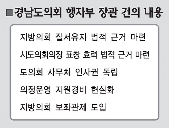 도의회, 지역 현안 외면…'밥그릇' 챙기기 -도민일보 경남 방문 행자부장관에게 지방 의정 예산 확충 등 요구 최근 행정자치부장관이 경남을 방문했을 당시 경남도의회가 공식적으로 다섯 가지를 건의했으나 대부분 의회의 권한 확대나 예산확충과 관련된 내용이어서 도의회가 잇속만 차리려 한다는 지적을 피하기 어려울 것으로 보인다. 경남도의회는 지난 6일 박명재 행정자치부장관이 방문했을 때 지방의회 질서유지 법적 근거 마련, 시도의회의장 표창 효력 법적 근거 마련, 도의회 사무처 인사권 독립, 의정운영 지원경비 현실화, 지방의회 보좌관제 도입 등을 건의했다. 지방의회 질서유지 법적 근거 마련은 지난 2005년 12월28일 선거구와 선거구별 의원 정수에 관한 조례 제정 당시 의사당 마당 버스안에서 회의를 진행한 사례 등 지방의회의 안건심의를 방해할 목적으로 집단행동을 하는 사람의 출입을 제한할 수 있는 법적인 근거를 마련해달라는 요구였다. 시·도의회 의장 표창 효력 법적 근거마련은 광역의회 의장이 공무원에 대해 표창을 하고는 있지만 실제 관련 규정이 없고, 6급 이하 공무원이 징계를 받을 경우 시·도지사의 표창을 받은 적이 있으면 그만큼 감경해주지만 도의회의장 표창은 아무런 효력도 없기 때문에 지방자치법에 관련 규정을 만들어 달라는 것이다. 도의회사무처 인사권 독립은 도의회 사무처장을 비롯해 사무직원의 인사권을 도지사가 행사하고 있어 직원들이 항상 경남도를 의식하기 때문에 실질적인 견제기능이 떨어진다는 판단에 따른 것이다. 지방의회 보좌관제 도입은 지방분권과 자치권의 확대로 심의대상 안건이 급격히 증가하고 있고 광역지자체의 경우 의사결정이 잘못되면 막대한 재정손실과 광범위한 주민 피해가 우려되기 때문에 지방의원의 전문성을 높이기 위해 의원 1인당 5급 상당의 별정직 또는 계약직 보좌관 1명씩을 배치할 수 있도록 해달라는 주문이다. 도의회는 의원 1인당 연간 610만원씩 책정된 의정운영공통업무추진비를 810만원씩으로 증액해줄 것도 요구했다. 의정운영공통업무추진비는 의원들이 매달 받는 월정수당이나 의정활동비 말고 도의회 차원이나 상임위원회 차원에서 개최하는 세미나, 간담회 등에 드는 비용이나 의원연구단체의 지원비용 등으로 쓰이는 공통비용이다. 도의회의 이 같은 공식 건의내용 중 지방의회 인사권 독립 등 일부는 사회적으로 공감대를 형성하고 있고 지방의회의 입장에서는 충분히 건의할 수 있는 내용이다. 그러나 건의내용 중에는 지역과 직접 관련된 현안이나 경남도민들의 삶과 직결된 지방분권, 지방재정 확보 등에 대해서는 아무런 언급이 없어 경남도의회가 오로지 지방의회의 권한 확대와 예산 확충에만 골몰하고 있는 것이 아니냐는 인상을 주고 있다. 이에 대해 경남도의회 관계자는 "지역과 관련된 건의는 집행부에서 하기 때문에 도의회에는 의회의 입장에서 건의를 한 것이며, 특히 이번 건의내용은 모두 전국 지방의회의 공통된 사안이며 우리 도의회만 해당되는 내용은 없다"고 말했다.