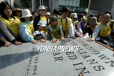 <'전쟁희생 無名시민'碑..손수레로 판문점行>-연합뉴스 (부산=연합뉴스) 오수희 기자 = 한국과 일본, 미국의 반전단체가 '전쟁에서 숨진 무명 시민들을 위해'라는 글이 새겨진 1t짜리 돌비석을 손수레에 싣고 부산에서 판문점까지 종단하기 위해 출발했다. 평화시민연대와 일제강점하강제동원희생자유족회 등 한ㆍ미ㆍ일 40여개 시민단체는 29일 오후 부산 민주공원에서 국제반전 평화순례행사인 '스톤워크(Stone Walk) 코리아 2007'을 개최했다. 이번 행사는 일제강점기와 한국전쟁 희생자를 추모하고 3개국 시민들의 화합을 위해 마련됐으며 일본실행위원회 측이 모금활동으로 제작한 비석을 손수레에 싣고 참가자 2천여 명이 릴레이 형식으로 끌면서 부산에서 판문점까지 대규모 도보행진을 하게 된다. 이날 부산 민주공원을 출발, 지리산과 광주, 대전, 평택 등을 거쳐 6월15일 판문점에 도착한 후 이 추모비를 세울 예정이며 행진기간에 광주 5.18묘지를 참관하고 경남 하동에서 열릴 일본군 위안부 정서운 할머니 추모비 제막식 등에도 참석한다. 히로세 마사이토 일본대표는 "45일간의 스톤 워크 순례로 일제강점기 전쟁 동원으로 희생된 한국인에게 사죄의 마음을 전하고 넋을 위로할 것"이라며 "이번 행사가 한일 우호관계 증진은 물론 아시아 뿐 아니라 세계 평화에도 기여할 것으로 기대한다"고 말했다. 원폭피해자와 전쟁희생자를 추모하기 위한 '스톤워크'운동은 1999년 미국에서 시작돼 영국, 아일랜드, 일본 등지에서 5차례 열렸으며 2005년 열린 '스톤워크 제팬' 행사에서는 일본인 1천500여명과 미국인 수십여 명이 1t 비석을 나가사키에서 히로시마까지 끌고 행진했다. 반전단체, 1t비석 끌고 부산→판문점 행진 (부산=연합뉴스) 오수희 기자 = 평화시민연대와 일제강점하강제동원희생자유족회 관계자 등이 29일 오후 부산 민주공원에서 국제반전 평화순례행사인 스톤워크(Stone Walk) 코리아 2007을 개최한 뒤 전쟁에서 숨진 무명시민들이라고 새겨진 1t 돌비석을 손수레에 싣고 출발하고 있다. 이들은 판문점까지 도보행진을 벌일 예정이다.