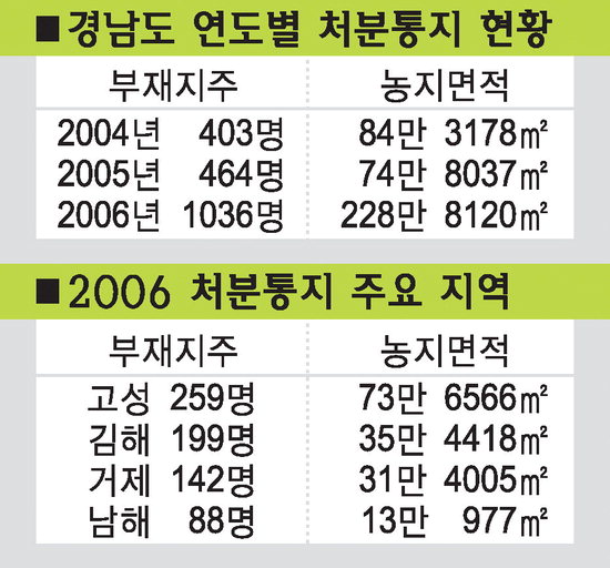 경남도내 '투기 목적' 농지 취득 늘었다 -도민일보 땅 놀려 처분통지 받은 부재지주 지난해의 2배 농지소유자 중 직접 농사를 짓지 않거나 땅을 놀려 처분통지를 받은 부재지주가 급격하게 증가한 것으로 나타났다. 이는 농지이용실태조사가 엄격해진 영향도 있지만 투기목적의 농지취득이 늘었다는 방증이다. 경남도는 지난 3~4월에 직접 농사를 짓지 않은 부재지주 1036명에게 처분통지를 했다고 8일 밝혔다. 처분통지를 받은 농지 면적은 228만8120㎡(69만2153평)에 이른다. 이는 지난해 9월부터 11월까지 농지이용실태조사를 벌인 결과 이용목적을 위반한 것 중 이의신청을 받아 최종 결정된 것이다. 연도별 처분통지 현황은 지난 2004년 403명(84만3178㎡)에서 지난해(464명, 74만8037㎡)까지는 큰 변동이 없었으나 올해는 지난해보다 인원과 면적에서 각각 2.2배, 3배 이상 급증했다. 지역별로는 고성이 259명(73만6566㎡)으로 가장 많았으며, 이어 김해(199명, 35만4418㎡), 거제(142명, 31만4005㎡), 남해(88명, 13만977㎡) 순으로 집계됐다. 지난해보다 고성과 김해는 각각 16배, 6.9배 늘었으며, 혁신도시 진주는 지난해 한 명도 없었으나 올해 22명이 처분 통지를 받았다. 이 같이 처분통지 건수가 급증한 것은 농사를 짓기 위한 목적이 아닌 투기 목적으로 한 농지 취득이 늘었기 때문으로 분석된다. 이에 대해 경남도 농업정책과 노현탁 농지이용실태조사 담당자는 "지난해 실태조사를 철저히 하기도 했지만 투기 목적으로 취득한 농지가 늘었다고 볼 수 있다"고 말했다. 이어 그는 "처분통지 건수가 많았던 지역은 개발호재가 많아 장래 시세차익을 위해 외지인의 농지 취득이 많은 곳"이라며 "농사를 안 지으려면 농지를 취득하면 안 된다"고 말했다. 한편 지난 96년 1월 농지법 개정으로 거리·지역제한이 없어져 도시민도 농지를 살 수 있게 농지취득제한은 풀렸지만 구입한 농지는 반드시 땅 주인이 1년에 90일 이상 직접 농사를 지어야 하도록 강화됐다. 직접 농사를 짓기 어려운 부재지주가 농지를 보유하려면 한국농촌공사의 농지은행에 맡겨 임대료를 받고 전업농에 임대하면 되지만 처분통지를 받고 나서는 맡길 수 없다. 농지 처분통지를 받으면 직접 농사를 짓거나 팔아야 한다. 농사를 짓지 않을 경우 처분통지기간 1년이 지나면 처분명령을 받게 되고, 그 뒤 6개월 내에도 팔지 않으면 이행 강제금(공시지가의 20%)을 물어야 한다. 지난해 도내 처분명령을 받은 부재지주는 336명(51만4324㎡), 96년 이후 현재까지 이행강제금이 매겨진 이는 939명에 이른다.