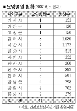 도내 노인요양병원 너무 많다 -경남신문 최근 몇 년 사이 도내에 적정 수요를 초과한 노인요양병원의 개원이 잇따르고 있지만 정부의 정책은 노인요양병원의 혜택을 줄이는 방향으로 진행되고 있어 조만간 상당수 병원이 심각한 경영난에 직면할 것으로 예상된다. 11일 건강보험심사평가원 창원지원(지원장 홍월란)에 따르면 경남지역의 노인요양병원은 2005년 19개. 2006년 31개. 2007년 6월말 현재 41개(총병상수 6674)로 매년 급격한 증가세를 보이고 있다. 이는 우리사회의 급격한 고령화 추세에 따라 수요자도 크게 늘어날 것으로 기대하기 때문이다. 지역별로 보면 김해 8개(병상수 1080). 마산 7개(1172). 창원 4개(702). 진주 4개(892). 밀양 3개(515). 진해 3개(591) 등이다. 하지만 문제는 노인요양병원의 증가가 보건복지부가 추정한 요양병원 이용자 수를 이미 초과하고 있다는 것이다. 보건복지부에 따르면 노인요양병원의 적정 수요는 65세 이상의 전체 노인 인구 중 30일 이상 장기요양 대상자 0.4%와 30일 미만의 입원자 0.2% 등 모두 0.6%로 추정된다. 이는 노인요양병원의 정책방향과 수요실태조사 등을 통해 도출된 것이다. 따라서 도내의 경우 지난해 말 현재 노인 인구가 33만7933명이라는 점을 감안할 때 노인병원의 적정 수요는 2027명에 불과하지만 병상수는 6674개로 수요 대비 3배 이상 초과했다. 시군별로도 노인 인구가 2만4815명인 창원지역의 경우 적정 수요는 148명에 불과하지만 병상수는 702개로 4.5배를 넘어섰다. 마산도 노인 인구 3만5571명 중 적정 수요는 213명이지만 병상수는 1172개로 5배를 초과했다. 여기다 창원과 마산은 하반기 중 각각 2개와 4개의 노인요양병원이 추가로 개원 예정이어서 적정 수요 대비 병상수는 훨씬 늘어날 것으로 보인다. 김해의 적정 수요는 172명이지만 병상수가 1080개로 5배 이상. 진주의 적정 수요는 200명이지만 병상수는 892개로 4배 이상이다. 심사평가원 창원지원 관계자는 “현재 요양병원들의 주 이용대상은 노인들이지만 노인만을 전문으로 하는 경우는 많지 않기 때문에 이 같은 적정 수요는 다소 차이가 있을 수 있다”고 지적했다. 한편 정부는 지난 4월부터 내과질환 환자에게 추가되는 의료수가인 내과질환 가산료의 억제를 비롯하여. 내년 1월부터 노인성질환에 대해 행위별 수가 대신 일당정액수가제 시행. 중풍·뇌졸중 등 뇌질환 발병 1년 경과 환자에 대해 수가를 인정하지 않는 전문재활인정제한. 내년 7월부터 노인장기요양보험 시행 등으로 인해 노인요양병원의 수익은 악화될 것으로 예상된다.