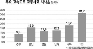 공포의 88고속도로 4차로 확장하자-국제신문 대부분 구간 왕복 2차로 고속도로 중 치사율 1위 노폭 좁아 위험 상존… 7개 시장·군수 확장 촉구 전국 고속도로 가운데 교통사고 치사율(사고 100건당 사망자 수)이 가장 높은 88고속도로를 확장하자는 움직임이 본격화되고 있다. 이 도로가 지나는 경남 거창 함양 합천군과 경북 고령군, 전북 남원시 순창 장수군 등 7개 자치단체장들은 20일 건설교통부를 항의 방문해 88고속도로 4차로 확장을 요구했다. ▲최고의 치사율=88고속도로는 국내 고속도로 가운데 유일하게 왕복 2차로로 앞차를 추월하려면 중앙선을 넘어야 하기 때문에 반대편 차량과 충돌하는 사고가 자주 발생하고 있다. 다른 고속도로와 달리 제한속도가 60~70㎞로 하향 조정됐지만 이를 지키는 운전자들을 찾아볼 수 없다. 도로교통안전관리공단이 지난 10년간 발생한 전국 고속도로 교통사고 분석 결과 88고속도로의 치사율이 전국 고속도로 중 가장 높은 것으로 나타났다. 이 기간 충돌 전복사고 등 모두 1394건의 사고가 발생, 442명이 숨져 31.7%의 치사율을 기록했다. 교통량이 늘어나면서 치사율도 1998년 22.1%, 1999년 28.1%, 지난해 33.7%로 증가세를 보이고 있다. 경인고속도로와 경부고속도로의 치사율은 각각 5.9%, 9.8% 수준이다. 88고속도로는 구조적으로 취약점을 안고 있다. 노폭(13.2m)이 좁고 직선 시야가 2㎞를 넘는 구간도 거의 없다. 구간 대부분이 산악지대를 통과하는 까닭에 도로가 가파르고 굽은 곳이 많다. 도로 경사가 5% 이상인 곳도 여덟 곳이나 된다. 도로교통안전관리공단은 사고 위험이 큰 급커브 구간 11곳을 비롯해 굴곡이 심한 구간이 고속도로 전체 구간의 30%인 50여 ㎞나 되는 것으로 분석하고 있다. 실제 사고의 78%가 이 같은 커브지점에서 일어났다. 특히 야간 운행을 할 때 일시적인 착시현상이 일어나기 쉬워 반대편 차선을 자기 차선으로 착각하는 현상이 종종 일어나고 있다. 이 도로를 이용하는 운전사 이상련(54) 씨는 "88고속도로는 운전자들 사이에서는 '공포의 고속도로'로 통한다"고 지적했다. 1984년 개통된 88고속도로는 전체 170.6㎞ 가운데 2006년 말 확장된 광주와 대구 쪽 28.3㎞(고서∼담양 16㎞, 옥포∼성산 12㎞)를 제외한 142.4㎞가 2차로로 남아 있다. 하지만 교통량은 만만치 않다. 2002~2006년 하루 평균 88고속도로 이용 차량은 4만 대 정도로 울산선(언양∼울산), 동해선, 대전남부순환선, 평택충주선(평택∼충주)과 비슷한 수준이다. ▲4차로 확장 건의=경남 거창 함양 합천군, 전북 남원시 순창 장수군 등 6개 시·군 대표들은 최근 전북 남원시와 경남 거창군에서 잇따라 모임을 갖고 '88고속도로는 호남고속도로 대전~통영고속도로 경부고속도로와 연계한 영호남 물류 수송 및 서부내륙 산간지역 균형개발을 위해 확장공사가 시급하다'는 데 뜻을 모았다. 이들 6개 시·군에 경북 고령군까지 가세해 7개 시·군이 도로 확장을 촉구하게 된 것이다. 건교부 관계자는 "88고속도로의 4차로 확장 사업은 검토 단계"라며 "올 하반기 중 국가기간 교통망 계획에 도로-철도 간 효율성 및 정밀 수요분석을 통해 추진 여부가 확정될 것"이라고 말했다.