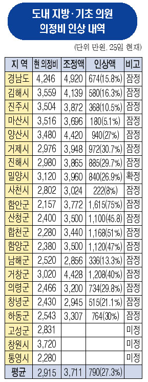 경남도·시·군 의원님들 의정비 대폭 인상 -경남매일 창원·통영·고성 제외 평균 29% 올려 도내 광역·기초의원들의 의정비 인상과 관련 논란이 일고 있는 가운데 대부분 지역이 최종결정을 1주일여 앞두고 인상잠정안을 결정했다. 25일 경남도와 일선 시·군에 따르면 창원, 통영, 고성을 제외한 18개 도·시군의회 의정비심의위는 현재 2,910만원인 평균 의정비를 3,711만원으로 29.1%인상안을 잠정결정 내지는 최종 결정했다. 가장 먼저 인상안을 확정한 밀양시는 22일 3,120만원인 현행 의정비를 26.9%인상해 3,960만원으로 최종 확정했다. 밀양시는 앞서 설문조사, 지역여론, 전국 도시근로자 평균 생계비 등을 고려했다고 밝혔다. 가장 많은 금액을 의정비로 조정한 곳은 경남도의회로 4,920만원을 잠정결정하면서 15.8%의 인상률로 이달 말 최종확정을 눈앞에 두고 있다. 다음으로 4,428만원으로 40%인상안을 잠정결정한 거창군은 파격적인 인상안으로 논란이 거센 지역이다. 양산시는 4,420만원의 조정안을 내면서 27%인상률을 놓고 오는 31일 최종확정할 예정이다. 김해시는 지난 22일 16.3%가 인상된 4,140만원의 조정안을 잠정결정하고 최종결정을 놓고 갑론을박을 이어가고 있다. 인상률로 1위를 차지한 곳은 함안군으로 2,157만원에서 3,772만원으로 무려 75%의 인상안을 잠정결정했다. 함안군의 높은 인상률은 도내 자치단체 중 기존 의정비가 가장 낮게 책정된데 따른 것으로 보인다. 다음으로 높은 인상률을 보인 산청군은 2,400만원에서 3,500만원으로 45.8%의 조정안을 잠정결정해둔 상태고, 합천군은 2,280만원의 의정비를 3,440만원으로 50%를 인상하는 잠정안을 결정해 인상률 3위를 차지했다. 함양군과 거창군은 47%와 40%의 인상률을 잠정결정하면서 인상률에서 각각 4, 5위를 차지했다. 지역별로 여론조사, 공무원급여, 근로자 생계비 등을 감안해 잠정안을 결정한 자치단체들은 이달 말께 최종안을 확정할 것으로 알려지고 있어 찬반양론이 거세지면서 인상후폭풍이 예견돼 연말 지역 정가는 의정비 인상안을 놓고 한동안 입씨름이 오갈 것으로 보인다.
