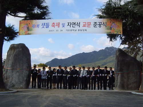 “바위가 교문이에요” -경남신문 거창 가조中 담장·교문 단장 자연석으로 꾸민 거창 가조중학교 교문 준공식. 거창군 가조중학교(교장 백광석)는 벽돌로 된 기존의 학교 담장과 교문을 헐고 자연석으로 새로 단장했다. 울타리 단장은 가조온천개발 정봉길 대표가 교육환경 개선을 위해 허름한 학교울타리를 헐고 130여m를 자연석으로 꾸몄고, 자연석 교문은 지난 5월 이 학교 출신으로 특강을 위해 방문한 강석진 군수에게 지원사업으로 건의해 이뤄졌다. 한편 지난달 26일 열린 교문과 담장 준공식에서 6회 졸업생이자 가조가북 3·1정신계승발전위원회장인 이영국씨가 학교발전기금으로 500만원을 기탁했다.