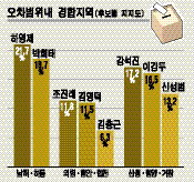 [4·9총선 여론조사-산청·함양·거창, 남해·하동] 前군수-現의원 선두다툼 -경남신문 의령.함안.합천 조진래.김영덕.김충근 오차범위 내 접전 산청·함양·거창, 남해·하동, 의령·함안·합천 선거구에서 현역 의원들이 전직 군수 또는 변호사 출신 정치 신인과 치열한 선두다툼을 벌이는 것으로 나타났다. 양산 선거구에서는 현역 의원이 상당한 차이로 2위를 앞서는 것으로 조사됐다. 경남신문이 창간 62주년을 맞아 경남리서치에 의뢰해 산청·함양·거창, 남해·하동, 의령·함안·합천, 양산 등 4개 선거구의 18대 총선 출마예상자들의 지지도와 한나라당 1차 면접통과자들의 선호도를 조사한 결과, 이같이 나타났다. ★관련기사 3면 산청·함양·거창 선거구 한나라당 1차 면접통과자 지지도 조사에서 강석진 전 거창군수(18.2%), 이강두 현 의원(17.3%), 신성범 전 KBS기자(15.7%) 순으로 나타났다. 1~3위간 지지율 차이는 0.9~2.5%포인트로 오차범위(8.0%) 이내다. 전체 총선출마예상자 14명 중에서도 강 전 군수(17.2%), 이 의원(16.5%), 신 전 KBS기자(13.2%) 순으로 나타났다. 1~3위간 지지율 차이는 0.7~4%포인트로 오차범위 내에서 치열한 접전을 벌이는 것으로 조사됐다. 무응답층도 49.2%에 달해 무응답층의 향방이 당선에 큰 변수가 될 전망이다. 남해·하동 선거구는 한나라당 1차 면접 통과자 중 하영제 전 남해군수(28.7%), 박희태 현 의원(23.0%), 조기안 전 행자부 국장(6.2%) 순으로 나타났다. 1~2위간 지지율 차이는 5.7%포인트로 오차범위(8.0%)이내다. 전체 출마예상자 8명 중에서는 하 전 군수(21.7%), 박 의원(18.7%), 무소속인 김두관 전 행자부 장관(9.0%), 조 전 국장(6.2%) 순으로 나타났다. 1~2위간 지지율 차이는 3.0%포인트로 오차범위 이내다. 의령·함안·합천 선거구는 한나라당 1차 면접통과자 중 조진래 전 대통령직인수위 자문위원(12.8%), 김영덕 현 의원(11.7%), 김충근 전 이명박대선후보 정책특보(7.3%) 순으로 나타났다. 1~3위간 지지율 차이는 1.1~5.5%포인트로 오차범위(8.0%) 이내다. 전체 출마예상자 11명의 지지율도 조 전 자문위원(11.8%), 김 의원(11.5%), 김 전 특보(6.3%) 순으로 나타났다. 1~3위간 지지율 차이는 0.3~5.5%포인트로 오차범위 내다. 무응답층도 60.0%로 높게 나타나 무응답층이 당락에 결정적인 변수가 될 전망이다. 양산 선거구는 한나라당 1차 면접통과자 중 김양수 현 의원(24.2%), 조문환 전 대통령직인수위 자문위원(8.3%), 유재명 전 해양연구소 책임연구원(6.2%) 순으로 나타났다. 1~2위간 지지율 차이는 15.9%포인트로 오차범위(8.0%)를 벗어났다. 전체 출마예상자 12명 중에서도 김 의원은 24.5%를 기록해 조 전 자문위원(7.8%), 유 전 연구원(6.0%)을 앞섰다. 이번 여론조사는 지난 2~3일 전화면접 방식으로 실시됐다. 응답률은 39.5~48.2%에 표본오차는 95% 신뢰수준에 ±4%포인트다.