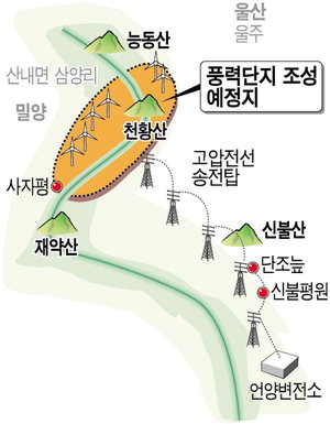 '영남알프스'에 풍력발전단지 추진 -국제신문 거꾸로 가는 밀양시 친환경에너지 정책 전력공급 위한 송전탑 설치도 울주군·울산 환경단체 반발 경남도와 밀양시가 민간 사업자를 유치해 울산시 울주군과 겹쳐 있는 능동산과 재약산 일대 일명 '영남알프스'에 초대형 풍력발전단지 조성을 추진하자 울주군과 울산지역 환경단체가 자연환경을 훼손하는 행위라며 거세게 반발하고 있다. (주)경남신재생에너지는 경남 밀양시 산내면 삼양리 일대 18만7000㎡에 993억 원을 들여 시설용량 50.6MWh 규모의 풍력발전단지를 내년 9월까지 완공하기 위해 올 하반기 공사에 들어갈 예정이다. 사업자는 풍력발전소에서 생산한 전력을 18.6㎞ 떨어진 울주군 삼남면 언양변전소에 판매하기 위해 능동산과 재약산 사자봉 5.7㎞ 능선 구간에 총 22기(울산 구간 4기, 밀양 구간 18기)의 풍력발전기를 건립할 계획이다. 앞서 경남신재생에너지는 풍력발전단지 조성을 위해 지난해 8월 당시 환경부의 사전환경성 검토와 산업자원부의 발전사업자 허가까지 마쳤다. 이 같은 사실이 알려지자 울주군과 울산지역 환경단체들은 10일 영남알프스의 경관 훼손을 이유로 사업 철회를 강력 주장하고 나섰다. 울주군은 언양변전소까지 풍력발전기의 전력공급을 위해 산 중턱에 수십여 개의 송전탑을 설치할 경우 수려한 경관의 훼손이 불가피하다고 지적했다. 울주군 관계자는 "풍력발전단지 조성에는 행정기관 간 사전협의가 필요한데도 현재까지 밀양시로부터 협의 통보조차 받은 적이 없다"며 "협의를 요청해 오더라도 산지전용허가에 대한 공청회 개최 등 충분한 여론 수렴과 검토가 우선돼야 한다"고 말했다. 울주군은 2003년부터 2010년까지 100억 원(국비 50억 원 포함)을 들여 간월재~신불산~재약산 구간의 등산로에 침목계단을 설치하는 등 영남알프스 생태복원사업을 추진해 왔다. 울산생명의 숲 등 울산지역 환경단체들은 "고산습지인 단조늪과 신불평원 등이 들어서 있는 신불산 능선 일대 골짜기마다 대형 철탑 수십여 개가 빼곡히 들어설 경우 동·식물의 생태계 교란 등이 불가피하다"며 "등산객들이 능선을 따라 고압선이 '윙윙'거리는 영남알프스를 다시 찾고 싶은 마음도 생기지 않을 것""이라고 지적했다. 특히 이들 단체는 이날 성명서를 통해 "풍력발전단지 조성 계획 백지화를 위해 거리서명을 전개하겠다"고 밝혔다. 이에 대해 밀양시 관계자는 "경남도와 함께 추진한 신재생 에너지사업인 만큼 밀양 구간에 산지전용 허가가 들어올 경우 법적 검토를 거쳐 하자가 없다면 산지전용허가를 내 줄 방침"이라고 말했다.
