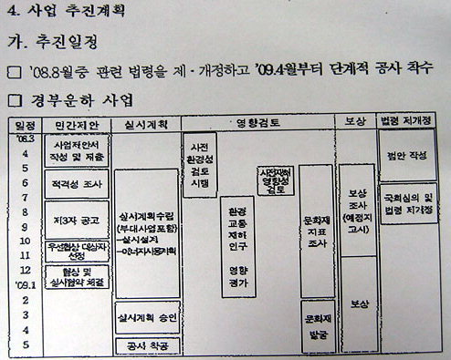 국토부, 대운하 비밀기획단 최근 급히 폐지 -도민일보 권도엽 차관, 민간 제안에 대비…SOC사업위해 운영 내년 4월 대운하를 착공하겠다는 내용을 담은 보고서를 작성해 물의를 빚었던 국토부가 비밀리에 '대운하 추진기획단'을 운영한 것으로 드러났다. 권도엽 국토해양부 1차관은 29일 오후 5시 과천정부종합청사에서 기자회견을 열고 최근 논란이 일고 있는 대운하 관련 의혹에 대해 "대운하사업을 위한 '비밀기획단'을 구성한 것은 아니다"라고 말했다. 그러나 권 차관은 대운하를 추진하기 위한 관련 사업단을 운영했던 사실은 일부 인정했다. 권 차관은 "새 정부 조직개편 이후 잉여 인력을 활용해 여러 개의 TF를 구성했으며, 그중 하나인 국책사업지원단에서 운하를 포함해 여러 SOC사업의 효율적 추진방안을 검토하려 했으나 최근 조직개편 취지에 맞춰 폐지했다"고 말했다. 권 차관은 "대통령 공약사항인 대운하는 대선당시부터 경제성, 환경영향 등에 대해 많은 논란이 있어 다양한 분야에 대해 세부적인 검토가 필요하다"며 "민간제안이 들어오면 본격적인 검토에 들어가겠지만, 사전에 철저한 준비가 필요하다"고 말해 사전 준비를 했음을 시사했다. 즉, 대통령 공약인 대운하를 주무부처인 국토부가 미리 준비하는 것은 당연하다는 논리인 셈이다. 권 차관은 "대운하 사업은 검토할 사항이 많으므로 민간제안서가 제출되기 전에 사전 준비를 철저히 하는 것은 정부의 기본 책무"라고 말해 이를 확인시켜 줬다. 그는 "정부는 앞으로 대운하사업 민간제안서가 제출되면 광범위한 여론수렴과 적법절차를 거쳐 국가경제에 이익이 되는 방향으로 검토해 추진할 계획"이라고 말해 사실상 추진 의사를 분명히 했다. 한편, 앞서 국토부는 과천 정부종합청사 인근 수자원공사 서울지역본부에 국토부 공무원들로 구성된 대운하 추진기획단을 운영했다는 의혹이 제기되어 물의를 빚었다. 한나라당이 최근 대운하를 총선공약에서 제외하는 등 정부와 여당이 겉으로는 쉬쉬하며 뒤로는 이미 건설회사의 제안에 대비해 물밑작업을 벌인 것이어서 거센 비난을 사고 있다. 이와 관련 '운하백지화국민행동'은 지난 24일 논평에서 "국민을 우습게 알아도 정도가 있는 법이다. 4월 총선이후 대운하 사업 추진을 위한 대대적인 공세가 예상되는 것은 누구나 다 아는 사실이다"고 지적했다. 또 "총선이 끝나면 바로 건설업체들은 대운하 사업제안서를 제출할 것이고, 국토해양부, 환경부 등은 일사분란하게 사업검토의견서를 제출할 것이고, 기획재정부는 간단하게 적격성 심사를 마치며 화답할 것"이라고 주장한 바 있다.