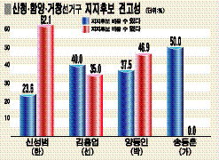 [총선 여론조사] 산청 함양 거창 -경남신문 (산청·함양·거창) 신성범 지지율·당선가능성 모두 선두 한나라당 신성범 후보가 지지율과 당선 가능성에서 자유선진당 김홍업, 친박연대 양동인, 평화통일가정당 송동훈 후보를 모두 앞서고 있는 것으로 나타났다. 지지율은 신 후보(30.2%), 양 후보(5.3%), 김 후보(3.3%), 송 후보(0.3%) 순이었고, 당선 가능성은 신 후보(35.0%), 양 후보(2.0%), 김 후보(1.7%), 송 후보(0.3%)로 조사됐다. 하지만 신 후보는 개인지지율이 한나라당 정당지지율 37.0%에 비해 7%포인트 가량 낮아 한나라당에 공천을 신청했던 상대 신청 지지자들의 반감이 작용한 것으로 보인다. 당선가능성은 남자(43.7%), 여자(26.7%)가 신 후보 당선 가능성을 응답했고, 양 후보는 남자 2.7%, 여자 1.3%, 김후보 남자 1.7%, 여자 1.6%, 송 후보는 남자 0.3%, 여자 0.3%만 당선 가능성이 있다고 응답했다. 지역별로는 신 후보가 산청(28.1%), 함양(34.5%), 거창(39.3%)에서 고루 당선가능성을 내다봤고, 양 후보는 산청(2%), 함양(1.1%), 거창(2.6%) 모두 당선 가능성이 낮은 것으로 답했다. 현재 지지하고 있는 후보를 바꿀 가능성에 대해서는 없다(57.2%), 있다(27.1%)로 나타났다. 지지자 가운데 바꿀 의향이 없다가 높은 후보는 신 후보(62.1%), 양 후보(46.9%)로 지지층이 견고했고, 바꿀 의향이 있다가 높은 후보는 김 후보(40%), 송 후보(50%)로 조사됐다. 정당별로는 한나라당 지지자(65.4%), 민노당 지지자(75%), 친박연대 지지자(58.3%)가 지지 후보를 바꿀 의사가 없다고 밝혔고, 자유선진당 지지자는 100% 바꾸겠다고 응답해 이채로웠다. 지지정당은 한나라당(37%), 친박연대(3.5%), 민주노동당(2%) 순이었고, 반드시 투표에 참여하겠다는 응답자는 79.8%였다.
