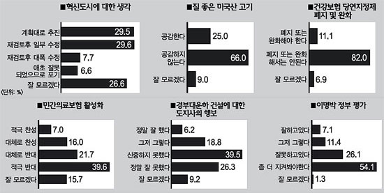 이명박 정부에 등 돌리는 경남 민심 -도민일보 본보 - Q&A리서치 '정책 현안 여론조사' 분석해봤더니 대운하·민영의료보험·미 쇠고기 수입 등 정책 현안에 '반대' 많아 이명박 정부 출범 이후 국민 생활과 가장 밀접한 문제로 이슈가 된 것을 꼽으라면 △한반도 대운하 건설 △건강보험 당연지정제 폐지·민영의료보험 활성화 △미국산 쇠고기 수입 파동을 들 수 있다. 이 세 가지 현안에 대해 지난 대선 때 이명박 후보를 지지했던 경남도민조차 부정적 입장으로 바뀌고 있는 것으로 나타났다. 경남 민심도 현 정부에서 급속히 이탈하고 있다는 것이다. ◇이명박 정부 평가 = 현 정부에 대한 경남도민의 평가 결과 △좀 더 지켜봐야 한다(54.1%) △잘못하고 있다(26.1%) △그저 그렇다(11.4%) △잘하고 있다(7.1%) 순으로 나타났다. 전체 응답자 중 대선 당시 이명박 후보를 지지했던 응답자는 56.2%였다. 이를 100으로 보고 현 정부 평가 결과를 분석해봤더니 지지했던 응답자 중에서도 '잘하고 있다'고 답한 사람은 12.3%에 불과했다. 59.1%는 '좀 더 지켜봐야 한다'며 관망 자세를 보였고, 15.8%는 '잘못하고 있다'는 쪽으로 돌아섰다. '잘하고 있다'는 전체 응답자를 학력별로 보면 대학 재학 이상은 5.9%, 고졸은 4.3%, 중졸 이하는 11.8%였다. 학력이 높을수록 이명박 대통령에게 박한 점수를 준 것이다. '잘못하고 있다'는 응답자는 대학 재학 이상 32.5%, 고졸 27. 3%, 중졸 이하 16%였다. 연령별로는 20대(26.7%), 30대(36.6%), 40대(28.4%)의 '잘못하고 있다'는 응답이 높았던 반면 50대(24.8%), 60대(20.8%), 70대 이상(12.2%) 등 나이가 많을수록 비율이 낮았다. ◇대운하 건설에 대한 입장 = 대운하 건설에 대해서는 △반대한다(46.7%) △면밀히 따져 결정해야 한다(33%) △잘 모르겠다(10.6%) △찬성한다(9.7%) 순으로 나타난 가운데, 학력과 연령별로는 다소 의외의 결과가 나왔다. 반대한다는 응답자를 학력별로 분석해봤더니 고졸(54%)이 가장 높았고, 대학 재학 이상(50.6%)과 중졸 이하(33.1%)가 뒤를 이었던 것이다. 찬성한다는 응답자 역시 고졸(8.4%)이 가장 낮았고, 대학 재학 이상(10.2%), 중졸 이하(10.5%) 순으로 많았다. 연령별로도 반대한다는 응답자는 30대(56%), 40대(53%), 50대(48%)가 높았던 반면 20대(39.5%)와 60대(33.8%), 70대 이상(35.7%)은 상대적으로 낮았다. 찬성한다는 응답자는 30대(7.3%), 40대(8.6%), 70대 이상(7%)이 비교적 낮은 반면 20대(12.8%)와 50대(10.2%), 60대(14.6%)가 높게 나타났다. 김태호 경남도지사가 '경남에 운하를 시범건설하고 싶다'며 이를 이명박 대통령에게 건의하기도 했다. 이에 대해서는 어떻게 생각하고 있을까? △신중하지 못했다(39.5%)고 생각하는 경남도민이 가장 많았고 △정말 잘못했다(26.3%)는 응답자가 그 다음이었다. △그저 그렇다(18.8%)와 △잘 모르겠다(9.2%)가 뒤를 이었고, △정말 잘했다(6.2%)는 극소수에 불과했다. 이에 대해서도 '정말 잘못했다'는 응답자 중 30대(28.8%), 40대(31%), 50대(29.3%), 70대 이상(25.2%)이 비교적 높았던 반면 20대(12.8%)와 60대(18.5%)는 낮았다. 특히 대운하에 대해 긍정적으로 보는 20대가 다른 연령대에 비해 상대적으로 높다는 것은 의외의 결과로 보인다. 마찬가지로 70대 이상의 부정적 입장이 60대에 비해 높다는 것도 눈길을 끄는 부분이다. ◇건강보험 당연지정제와 민영의보 = 예상대로 건강보험 당연지정제에 대해 이해하고 있는 사람은 적었다. '정부가 건강보험 당연지정제 폐지 및 완화를 추진하려고 합니다. 건강보험 당연지정제가 무엇인지 알고 계십니까'라고 물었더니 '잘 알고 있다'는 사람은 11.9%에 불과했다. 열 명 중 한 명 정도에 불과하다는 말이다. '조금 안다'는 사람도 17. 1%였으며, '잘 모르겠다'는 사람이 71%로 대다수였다. 그래서 '건강보험 당연지정제가 폐지·완화되면 건강보험으로 치료를 받을 수 있는 병원과 받을 수 없는 병원이 구분된다'고 설명한 후, 이를 어떻게 생각하느냐고 물었다. 그랬더니 '폐지 또는 완화해서는 안 된다'는 답변이 무려 82%나 됐다. 이 문제가 국민들에게 제대로 알려지면 미국산 쇠고기 파동 이상으로 폭발력을 가질 수도 있음을 보여주는 결과다. 물론 그럼에도 '폐지 또는 완화되어야 한다'는 응답이 11.9%였고, '잘 모르겠다'는 사람도 6.9%였다. 이는 고소득층의 경우 건강보험이 불리하다고 볼 수도 있기 때문에 당연한 수치로 풀이된다. 이런 여론을 의식해서인지 정부도 '당연지정제 폐지 또는 완화는 없던 일로 하겠다'고 밝혔다. 그럼에도 민간의료보험 활성화는 계속 추진하겠다는 입장은 포기하지 않고 있다. 이는 상당한 모순을 안고 있지만, 그 의미를 제대로 아는 국민이 얼마나 될지는 미지수다. 그래서인지 '정부는 기존 건강보험과 별도로 민간의료보험 활성화를 추진하려 합니다. 어떻게 생각하십니까'라는 질문에는 반대한다는 의견이 당연지정제보다 다소 적게 나왔다. '적극 반대한다'(39.6%), '대체로 반대한다'(21.7%) 등 반대의견이 61.3%였던 것이다. '적극 찬성한다'(7%)와 '대체로 찬성한다'(16%) 등 찬성의견도 13%로 당연지정제 찬성보다는 다소 높았다. 다만 '잘 모르겠다'는 응답도 15.7%였다. ◇미국산 쇠고기 수입 = 이미 국정 최대 이슈가 되어 있는 미국산 쇠고기 수입