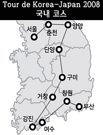 투르 드 코리아-재팬 창원·거창서 열린다 -도민일보 내달 21일 일본서 출발, 한-일 2500㎞ 자전거 경주 26일 창원 120㎞·28일 강진-거창 211㎞구간 포함 자전거를 주제로 한 국내 최대 스포츠이벤트인 '투르 드 코리아-재팬 2008(Tour de Korea-Japan 2008)' 대회가 창원과 거창에서도 열린다. 14일 창원시와 거창군은 각각 내달 26일과 29일 투르 드 코리아-재팬 2008 국제사이클대회를 개최하기로 하고 이날 서울에서 주최 측인 국민체육진흥공단·대회조직위원회와 협약을 했다고 밝혔다. 이번 대회는 일본에서 개막해 우리나라 부산, 창원, 여수, 강진, 거창, 구미, 단양, 양양, 춘천을 거쳐 서울에서 끝나며 전체 경주 거리가 2500㎞에 달한다. 6월 21일 일본 구마모토현 야마가시에서 개막식과 함께 시 외곽을 순환하는 150㎞ 대회가 열린 뒤 선수단이 부산으로 이동, 25일 부산에서 100㎞ 대회가 개최된다. 창원에서는 26일 오전 10시 종합운동장 만남의 광장을 출발해 시청 앞 광장, 소계 광장, 동읍, 대산면, 북면을 거쳐 다시 명곡광장, 만남의 광장으로 돌아오는 120㎞ 대회가 열린다. 거창에는 28일 오전 전남 강진에서 출발한 선수들이 211㎞를 달려 이날 오후 거창읍에 도착해 구간 시상식을 한다. 참가 선수들은 거창에서 하룻밤을 묵고 29일 오전 경북 구미까지 159.3㎞ 장정에 나선다. 대회는 사이클선수가 참가하는 엘리트 경주와 상당한 수준에 이른 동호인이 주로 참여하는 스페셜 경주, 일반동호인과 지역 주민이 참여하는 이벤트 경주로 나눠 열린다. 엘리트 경주에는 15개국 200여 명의 프로선수와 200여 명의 국내 아마추어 선수가 참여할 예정이다. 투르 드 코리아-재팬 2008은 프로·아마추어 선수, 동호인과 지역 주민이 함께 참여하는 아시아 최고의 사이클대회를 지향한다. 대회의 배경에는 자전거가 지구환경 문제, 인류 건강 문제, 교통 문제, 에너지 문제를 해결할 수 있는 대안이라는 인식이 깔려 있다. 창원시와 거창군은 이번 대회에 가능한 많은 주민이 참가하도록 별도의 행사를 준비 중이다. 창원시 관계자는 "일반 동호인이나 주민이 대회 공식경주에는 참여하기 어려워서 시내 간선도로 일부 구간에서 주민참여행사를 열거나 예전 F3 서킷에서 학생들을 대상으로 한 대회 개최 등을 검토 중"이라며 "이번 대회 개최로 녹색 교통수단인 자전거 타기 운동 확산과 지역 명소 홍보에도 도움이 될 것으로 기대한다"고 말했다. 한편, 작년 투르 드 코리아 국제사이클대회는 9월 1일부터 9일간 서울-양양-단양-연기-정읍-강진-함양-부산을 이어 달리는 대회로 개최됐다. 세계적으로는 1903년 시작돼 매년 7월 프랑스 전국을 일주하는 '투르 드 프랑스' 국제사이클대회가 유명하다.