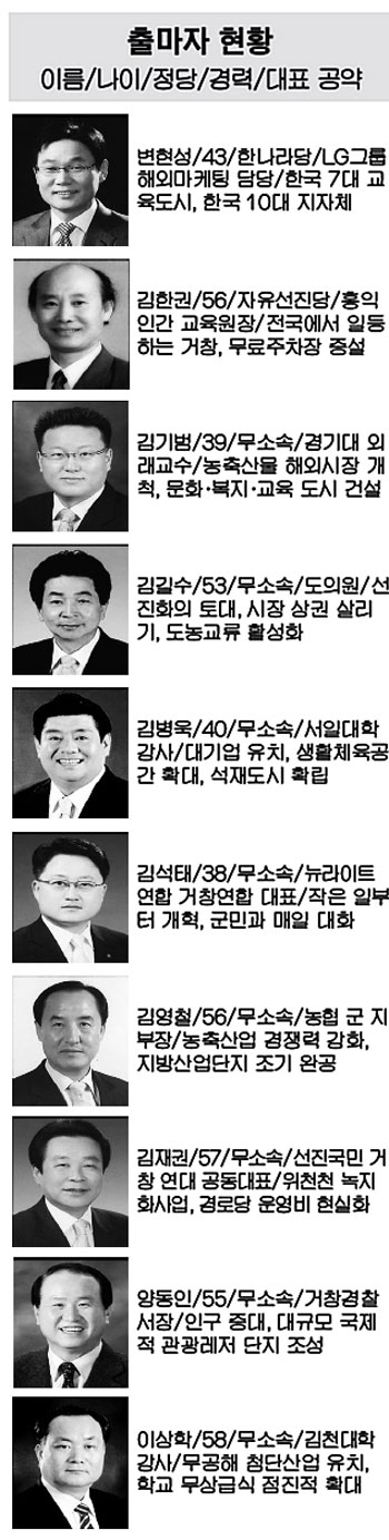 [누가 뛰나]②거창군수…10명 출마 '전국 최대 격전지' -도민일보 한나라당 공천 탈락 반발, 무소속 8명 등록 단일화 가능성 있어 성사 여부에 관심집중 6·4 재보선을 앞두고 모두 13명의 예비후보가 난립했던 거창군수 보궐선거는 한나라당 공천에서 탈락한 예비후보들이 낙하산 공천에 반발해 대거 무소속 후보로 등록하면서 모두 10명의 후보가 출마해 전국 최대의 격전지를 예고하고 있다. 이들 중 한나라당과 자유선진당 후보를 제외한 8명이 무소속으로 나서 저마다 자신들에게 미칠 유·불리를 계산하기에 바쁜 가운데 본격적인 선거운동에 들어가면서 유권자의 표심이 어디로 쏠릴지 관심이 집중되고 있다. 특히 무소속 후보 간에 단일화 등 연대 가능성도 감지되고 있어 성사 여부가 관심거리로 떠올랐다. ◇한나라당 변현성 후보 = 마케팅 기획그룹 펜톤고릴라 대표로 있는 변현성(43) 후보는 △교육투자 강화와 교육기반 도농복합 상품 개발로 한국 7대 교육도시 진입을 비롯해 △탈 우물 시각과 시야에서 경쟁력을 강화하고 경제구조와 체질을 변화시킴으로써 한국 10대 지자체 진입 등을 축약한 '713 프로젝트'를 핵심 공약으로 내세웠다. ◇자유선진당 김한권 후보 = 23년째 '홍익인간 교육원'을 운영하고 있는 김한권(56) 후보는 가조면 일대에 일본 관광객 유치를 위한 역사관광벨트 조성을 주요 공약으로 내걸었다. 또 △폐교가 된 각 초등학교를 교육청과 협의해 사회교육시설로 추진하고 △거창읍 하천 터에 상설 무료주차장을 증설하는 방안도 제시했다. ◇무소속 김기범 후보 = 경기대학교 외래교수를 역임한 김기범(39) 후보는 지역경제 활성화를 통한 소득 증대와 문화·복지·교육도시 건설로 행복한 거창 만들기에 힘을 쏟는 한편 △지역에서 생산되는 친환경 농축산물의 수출 활로를 확보하기 위해 해외시장 개척에 역점을 두겠다고 공약했다. ◇무소속 김길수 후보 = 제7대 경남도의원을 지낸 김길수(53) 후보는 이번 한나라당의 공천이 군민을 무시했다며 탈당과 함께 독자노선을 천명하고 △도농교류 활성화 △직거래 장터 개설 등을 통한 농·축산업 경쟁력 확보 등을 공약으로 내세웠다. ◇무소속 김병욱 후보 = 고 김동영 의원의 아들인 김병욱(40) 후보는 부친 후광보다는 뚝심과 배짱, 국제적 감각을 바탕으로 거창의 자존심을 되살리겠다며 민심을 두드리고 있다. 그는 △한국 50대 기업유치를 통한 인구 및 고용 증가로 지역경제를 활성화하고 △거창을 거창석의 전시관으로 탈바꿈, '스톤 시티(Stone city·석재도시)' 브랜드를 확립하겠다고 밝혔다. 생활체육 공간 확대와 교육 놀이방 육아시설 지원 등도 공약했다. ◇무소속 김석태 후보 = 뉴라이트 학부모 경남거창 연합 대표와 지역 주간신문사 발행인을 지낸 김태석(38) 후보는 작은 일부터 개혁하고 바로잡아 큰일을 이루는 발판으로 삼고 실천하는 일꾼이 되겠다는 점을 강조하며 △농·축산물 직거래를 적극 추진하고 유통 노선을 확충하며 △군민과 매일 대화하는 시간을 갖겠다고 공약했다. ◇무소속 김영철 후보 = 농협중앙회 거창군지부장을 지낸 김영철(56) 후보는 농협 CEO 경험을 바탕으로 농촌과 농민의 아픔, 거창의 문제를 꿰뚫고 있다는 장점을 내세워 행정과 경제 마인드를 결합한 퓨전 정책을 통해 '힘 있는 미래 거창의 디자이너'가 되겠다고 밝혔다. 그는 △출산장려와 양육 및 교육비 지원 △농·축산물 브랜드 특화와 체험관광 농업 육성을 통한 부자 농촌건설 등을 공약으로 제시했다. ◇무소속 김재권 후보 = 행정공무원 출신인 김재권(57) 후보는 기본이 바로 선 반듯한 거창과 지역경제 활성화를 주요 공약으로 내세웠다. △위천천 녹화사업 추진 등으로 쾌적한 도시기반시설 조성 △경로당 운영비(유류대 등) 현실화로 복지군정 실현 등이 대표 공약이다. ◇무소속 양동인 후보 = 지난 4·9 총선에 나섰다가 낙선한 양동인(55) 후보는 거창경찰서장을 지낸 행정 경험과 경륜을 강조하며 인구 증대를 최대 공약으로 제시했다. 그는 또 △거창시장 시설개선 및 활성화 △농촌 소득 증진사업 및 농업경영기반 조성 등을 공약했다. ◇무소속 이상학 후보 = 지난 2006년 민선 4기 거창군수 선거에 도전했다 낙마한 이상학(58) 후보는 민간기업 근무경험을 바탕으로 주식회사 거창의 CEO로 무공해 첨단기업 유치를 약속했다. 이와 함께 △초·중등교 무상급식 점진적 확대 지원 및 평생학습도시 확대 지원 △농촌체험마을, 산지체험마을 마케팅 지원 등으로 후손을 위한 생태가 살아있는 도시건설 등의 공약을 내놓고 있다.