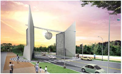 시간·인간·공간이 함께하는 거창관문 -경남매일 군, 디자인공모서 (주)화성건설 작품 최종 선정 거창군이 실시한 대형 화강석 조형물 디자인 공모에 최종 선정된 작품의 디자인. 거창군이 실시한 대형 화강석 관문인 조형물 디자인 공모에서 (주)화성건설이 응모한 작품(사진)이 최종 선정됐다. 화성건설이 응모해 선정된 미래 군의 랜드 마크 컨셉은 시간·인간·공간 등 삼간(三間)이 거창과 소통하는 것이 특징이다. 심사위원인 백경원 부산 동의과학대 교수는 “거창 화강석 조형물과 사과 형태의 금속 구조물 등 전혀 다른 의미를 담은 두개의 조형물이 연출하는 분위기가 새롭게 도약하는 거창의 상징으로서 손색이 없었다”며 “특히 화강석으로 된 구조물에 전통 문살을 모티브로 연출해 조형물 자체로 관문을 표현하고자 한 작품 “이라고 평했다. 랜드 마크 디자인 공모는 군의 향토 부존자원인 화강석을 군의 상징물로 삼아 널리 알릴 목적으로 관문(조형물) 설치 사업에 대한 군민들의 설문조사 결과에 따라 추진됐다. 3일 거창군에 따르면 랜드 마크 디자인 공모는 지난달 28일 마감 결과 모두 8개 업체가 응모, 공모 작들을 심사한 결과 이 업체가 최고 점수를 받았다고 밝혔다. 이 조형물은 거창읍 대평리 검문소에서 만남의 광장 사이에 예산 10억 원을 투입, 거창 화강석을 주재료로 한 21m 높이의 조형물이 25m 도로를 가로질러 세워질 예정이다. 이 같은 조형물은 지난해 12월 26일부터 12일간 인터넷 군 홈페이지를 통한 군민들의 설문조사 결과를 토대로 추진됐으며 올 10월께 완료한다는 계획이다.