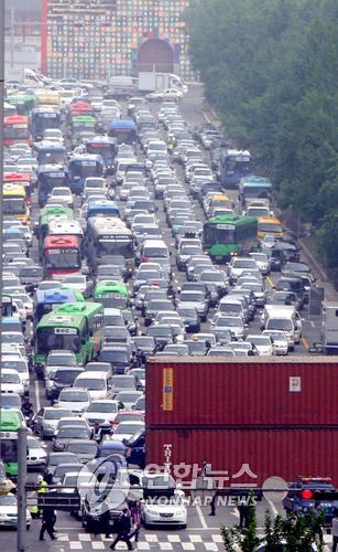 `6.10 촛불' 앞두고 광화문 도로차단..2개 차로만 허용 -연합뉴스 컨테이너에 막힌 출근길! (서울=연합뉴스) 이정훈 기자 = 대규모 촛불시위가 예정된 10일 오전 서울 세종로사거리 광화문 방면 차로가 경찰이 설치한 대형 컨테이너박스로 차단돼 극심한 정체를 빚고 있다. 경찰은 세종로 이순신장군 동상 앞 도로에 컨테이너박스 20여개를 동원해 차벽을 설치했으며 양 방향 각각 2개 차선에서만 차량 통행을 허용하고 있다. uwg806@yna.co.kr (서울=연합뉴스) 강건택 기자 = 대규모 촛불시위가 예정된 10일 서울 세종로사거리 광화문 방면 10개 차로 중 6개 차로가 대형 컨테이너박스로 차단돼 차량 소통이 어려움을 겪고 있다. 경찰은 오전 1시께부터 세종로 이순신장군 동상 앞 도로에 컨테이너박스 20여개를 동원해 차벽을 설치했으며 양 방향 각각 2개 차선에서만 차량 통행을 허용하고 있다. 경찰은 "오늘 대규모 시위에 대비해 양 방향 2개 차로를 제외하고 차벽을 설치했다"고 설명했다. 경찰은 그 동안 시위대가 밧줄을 이용해 전경버스를 치우고 차벽을 돌파한 사례가 있다는 점을 고려해 이번에는 컨테이너박스를 2층으로 쌓고 서로 단단히 고정시키는 방식으로 차벽을 쌓아 놓았다. 그러나 예고도 없이 새벽부터 도심 대로를 막아놓는 바람에 출근길 교통정체가 극심해 운전자들의 항의가 잇따르고 있다. 택시 운전기사 최 모 씨는 "차로가 막힌 줄 모르고 세종로에 들어섰다가 혼이 났다"며 "출근시간이 지나고 설치를 해도 늦지 않을 텐데 왜 이렇게 일찍 길을 막았는지 모르겠다"고 불만을 터뜨렸다. 6.10항쟁 21주년인 이날 오후 7시 서울광장에서 미국산 쇠고기 전면 수입 등에 반대하는 대규모 촛불시위가 진행될 예정이다.