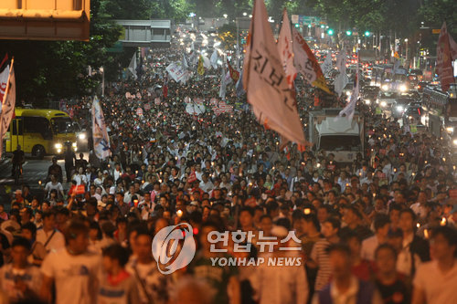 <`6.13' 이후 촛불집회, 앞으로 어떻게 되나> -연합뉴스 행진하는 촛불 문화제 참가자 (서울=연합뉴스) 최재구 기자 = 13일 미국산 쇠고기 수입 반대 촛불 문화제에 참여한 시민들이 서울 시청 앞에서 여의도로 행진하고 있다. jjaeck9@yna.co.kr (서울=연합뉴스) 장재은 기자 = 대규모 인파가 모여든 `6.10 촛불대행진' 이후 향후 촛불집회의 향배를 가늠해볼 수 있는 분기점으로 여겨졌던 13일 집회 주최 측은 경찰 예상을 뛰어넘은 규모의 시민들이 집회에 참여하면서 기세를 재확인했다는 평가를 내리고 있다. 그러나 이날 보수 성향 단체들의 촛불반대 시위에 따른 일부 충돌 양상과 화물연대 파업을 비롯한 일련의 노동계 투쟁에 따른 국가경제 불안, 정부의 쇠고기 추가협상과 향후 민심수습 대책 등이 맞물리면서 촛불집회의 앞날은 여전히 유동적이라는 분석도 나오고 있다. ◇ 격화론 = 2002년 미군 장갑차에 깔려 숨진 고(故) 효순ㆍ미선양의 추모제를 겸해 열린 13일 촛불집회에는 최소 1만5천여 명(경찰 추산, 주최 측 3만여 명)이 모여 미국산 쇠고기 수입의 전면 재협상 등을 촉구했다. 경찰은 당초 약 7천명이 참여할 것으로 예상했다. 40여 일간 계속된 집회로 시민들이 피로감을 보이고 있는데다 앞선 11일, 12일에는 수백 명이 모였다가 일찍 해산하는 등 촛불집회가 소강국면에 들어서는 조짐을 보인 상황이어서 이날은 향후 집회와 시위의 강도를 미리 점쳐볼 수 있는 잣대로 주목을 받았었다. 광우병 국민대책회의는 이날도 많은 시민들이 참여해 집회와 거리시위가 이뤄진 것은 정부의 `추가협상' 방침이 본질을 외면한 미봉책에 불과하고 궁극적인 해결책은 `전면 재협상' 밖에 없다는 점을 재차 확인하는 것이라고 주장하고 있다. 20일까지 정부가 전면 재협상에 들어가지 않으면 정권퇴진 운동을 불사하겠다는 입장인 국민대책회의는 이런 기세로 볼 때 정권에 대한 비판과 저항이 더 격화하고 쇠고기 수입 문제에서 벗어나 교육, 대운하, 공기업 민영화 등으로 의제가 다양화할 것이라는 관측을 내놓고 있다. 아울러 민주노총이 14일까지 총파업 찬반 투표를 실시, 향후 총파업에 돌입할 경우 미국산 쇠고기 수입을 반대하는 흐름에 조직적으로 가세할 가능성이 높은 점도 촛불집회의 동력을 더욱 강화할 수 있는 요인으로 분석되고 있다. 이런 상황에서 정부의 추가협상 내용이 알맹이가 없다고 시민들이 판단한다면 촛불시위가 더욱 격화할 것이라는 관측도 나온다. ◇ 진화론 = 하지만 최근 부쩍 늘어난 보수 성향 단체들의 맞불집회와 마냥 흔들리기만 하는 국정에 대한 상당수 국민의 우려 등 `촛불의 열기'를 식힐 수 있는 변수들도 많은 상태여서 격화론에 제동을 걸고 있다. 보수단체들을 주축으로 "촛불집회 때문에 국가위기가 왔다"는 주장이 본격적으로 제기되는 가운데 일반 시민들 사이에서도 "시위가 정도를 넘어 사회 불안을 초래하고 있다"거나 "얻을 수 있는 만큼 얻었으니 이제 그만하자"는 우려와 목소리가 촛불집회 초반보다 많이 나오고 있다. 사상 유례없는 유가와 원자재가 상승, 화물연대 파업에 따른 물류 마비 등 사회에 악재가 계속 이어지고 있지만 정부나 정치권이 제 역할을 제대로 하지 못하고 있어 이대로 가다간 자칫 `총체적 난맥'에 빠지는 것 아니냐는 걱정도 퍼지고 있다. 아울러 보수 성향 단체들과 물리적 충돌이 빈발할 경우 사회분열과 안전을 우려하는 인식이 확산되면서 그동안 가족, 연인 단위가 주축을 이뤘던 촛불집회 참여자들이 현저히 줄어들 것이라는 예측도 일각에서 내놓고 있다. 촛불집회 참여자들이 초기 고교생이나 주부, 가족, 자영업자 등 `무정형 그룹'에서 점차 노조와 대학생 및 이익집단 등의 조직적인 참여가 두드러지는 양상으로 바뀌고 있다는 분석이 나오는 것도 가족단위 참여자들에겐 부담이 될 수 있다. 이날 서울시의 가로 정비 사업에 반발하는 전국노점상연합회가 무려 8천500여명의 노점상을 집회에 동원한 점이 경찰이 당초 예측했던 것보다 훨씬 많은 인원이 참여하는 계기가 됐다는 것이다.