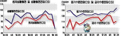 도민 살림살이 나빠졌다 -경남신문 생활·소득형편 소비자동향지수 급락 … 물가 상승 우려 커 도내 소비자들이 치솟는 물가로 생활형편이 크게 악화됐고, 향후 6개월 동안 물가상승을 매우 우려하고 있는 것으로 조사됐다. 26일 한국은행 경남본부가 지난 2~13일까지 도내 10개시 30개동 300가구를 대상으로 조사한 ‘2/4분기 소비자동향지수(CSI)’ 결과에 따르면 2/4분기의 현재 생활형편CSI는 전분기보다 15포인트 하락한 68로, 생활형편전망CSI는 25포인트 하락한 67로 조사됐다. 이는 현재의 생활형편이 6개월 전에 비해 상당히 나빠졌으며 향후 6개월 동안의 생활형편도 크게 악화될 것으로 전망한 것이다. 소득형편은 모든 소득계층에 걸쳐 크게 하락했으며, 100만원 미만 층의 생활형편전망CSI는 76에서 58로 낮아졌고 300만 원 이상 소득층에서도 91에서 67로 큰 폭으로 하락했다. 소비자들은 향후 1년 동안 가계수입이 감소할 것으로 전망했으며 자영업자나 봉급생활자나 모두 큰 폭의 하락을 예상했다. 2/4분기 현재 경기판단CSI는 전분기보다 31포인트 하락한 40으로, 향후 경기전망CSI는 46포인트 하락한 50으로 나타났다. 소비자들은 현재의 경기상황이 6개월 전에 비해 현저히 악화됐고 향후 6개월 동안의 경기상황에 대해서도 부정적으로 본 것이다. 이에 따라 취업기회도 줄어들 것으로 내다봤다. 향후 6개월 동안의 취업기회전망CSI는 전분기(97)보다 30포인트 하락한 67로 취업상황이 나빠질 것으로 전망하는 소비자들이 크게 늘어났다. 모든 계층이 취업기회가 줄 것이란 예상 속에 30대(96→56), 40대(98→56)가 큰 폭으로 하락했다. 이에 반해 물가수준전망CSI는 전분기보다 13포인트 상승한 161로 조사돼 향후 6개월 동안의 물가상승에 대해 매우 우려하는 수준으로 나타났다. 향후 6개월 동안의 금리수준전망CSI는 115로 전분기(108)보다 7포인트 상승하여 향후 금리가 상승할 것으로 내다봤다. 한은 경남본부 관계자는 “경남본부가 소비자동향지수(CSI) 조사를 시작한 지난 2002년 4/4분기 이후 생활형편과 경기판단CSI가 가장 낮고 물가수준전망CSI는 가장 높은 수준을 기록했다”며 “물가오름세를 잡지 않으면 생활형편이 개선되기 어려울 것으로 보인다”고 말했다. 한편 생활형편전망CSI가 기준치 100을 상회(하회)하면 앞으로 생활형편이 좋아질(나빠질) 것이라고 응답한 소비자가 나빠질(좋아질) 것으로 응답한 소비자보다 많다는 것을 의미한다.