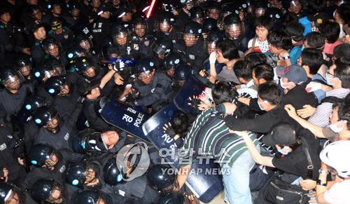 <촛불시위 왜 격렬해졌나> -연합뉴스 격렬 대치하는 시위대와 경찰 (서울=연합뉴스) 서명곤 기자 = 25일 오후 미국산 쇠고기 수입 반대 거리시위에 참가한 시위대가 신문로 새문안교회 뒷편에서 경찰과 격렬하게 대치하고 있다. seephoto@yna.co.kr "정부가 전면전 선포" vs "주최 측 책략" "경제난 등 사회적 불만도 작용" (서울=연합뉴스) 장재은 기자 = 미국산 쇠고기의 수입을 반대하는 촛불시위가 벌어진 25일 밤 26일 새벽 사이 곳곳에서 시위대와 경찰이 충돌하는 격렬한 양상을 보인 데는 여러 요인이 복합적으로 작용한 것으로 풀이된다. 먼저 25일 밤-26일 새벽 시위는 지난 1일 새벽 이후 25일 만에 물대포가 등장하고 수백 명의 시위대와 전.의경이 난투극을 방불케 하는 몸싸움을 벌이는 등 앞서 비교적 평온하게 치러지던 촛불시위와는 사뭇 다른 양상으로 전개됐다. 이는 지난 10일 '6.10 대행진'에 최소 20여만 명의 시민들이 참여했지만 비폭력적으로 진행된 것과 대조되는 대목이다. 이런 현상이 발생한 것과 관련, 손꼽을 수 있는 요인으로는 첫째 정부의 고시 결정에 따른 시위 참가자들의 격앙된 반응을 들 수 있다. 촛불집회에 참여하는 시민단체 소속 활동가와 일반 시민들 및 대학생과 노조원들은 정부가 고시 강행의 근거로 삼은 미국산 쇠고기 추가협상의 결과가 4월 18일에 이뤄진 한미 쇠고기 협상의 범위를 넘어서지 못한다는 입장을 갖고 있다. 이런 상황에서 정부가 미 쇠고기의 한국 진입을 위한 마지막 법적 절차인 고시 결정을 내리자 광우병 국민대책회의는 "정부가 국민을 상대로 전면전을 선포했다" 며 격분했고 이에 동조하는 시민들이 거리로 뛰쳐나온 것으로 관측된다. 이와 함께 경찰의 강압적인 시위 대처 방식도 시민들의 격앙된 감정과 맞물리면서 25일 대낮부터 심상찮은 기류가 감지됐다. 경찰은 25일 오후 3시께 청와대 부근 청운동 등지에서 기습시위를 벌인 시민들을 이전과 달리 적극적으로 연행에 나섰고 이런 소식은 서울시청 앞 광장 등지에 모여 있던 촛불집회 참여자들에게 전달되면서 상승작용을 일으켰다. 수십 명이 연행됐다는 소식에 접한 집회 참여자들은 저녁 촛불문화제를 30분 만에 끝내고 세종로 사거리를 향했고 곧바로 청와대 쪽으로 거리행진을 시도했다. 시위대 측은 정부의 불법집회에 대한 엄단 방침에 따라 경찰이 촛불집회 참여자들에 대한 대응 수위를 강경 진압기조로 전환, '폭력진압'에 나서는 바람에 시위가 격화되고 양측 간 부상자가 속출했다고 보고 있다. 하지만 경찰의 입장은 다르다. 경찰은 시민들의 지지를 잃고 추동력을 잃어가는 국민대책회의가 위기감을 느껴 새로운 변수를 만들려고 짜낸 책략이 25일과 26일 불거진 과격시위라고 보고 있다. 경찰청 관계자는 "앞으로 집회가 사그라질까 하는 염려와 향후 의제상정에 관한 논란이 나오면서 촛불 장외투쟁의 정도가 약해질 것을 우려하는 주최 측이 강하게 한 번 붙여 변수를 유발해보자는 생각으로 나선 것 같다"고 말했다. 이 관계자는 이어 "미국산 쇠고기 고시의 관보 게재를 계기로 시위에 대한 공감대를 다시 결집하려고 한 것으로 보이지만 경찰은 시위대를 자극하지 않기 위해 최대한 인내 기조를 유지했다"고 강조했다. 한편 이날 시위가 격화된 데는 경기침체, 고유가 등 물가불안, 실업문제 등으로 촉발된 사회에 대한 불만도 일정 부분 작용했다는 관측도 나온다. 26일 새벽까지 시위에 참여한 이들 가운데는 노동조합원 등 직장인과 중고등학생들보다는 일정한 직업이 없어 평일 밤샘이 덜 버거운 성인 남성들과 대학생 등이 두드러지게 목격됐기 때문이다. 지금까지 촛불집회에서 버스에 불을 붙이려고 하거나 쇠파이프, 장도리 등을 휘둘러 전 의경들을 다치게 하거나 차량을 훼손하는 등 과격.폭력 행위를 보여 구속된 이들도 40∼50대 저소득층 서민과 노숙자, 연령이 20대인 대학생 및 일용직 노동자 등으로 조사된 바 있다.