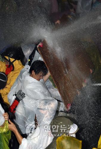 경찰, 촛불집회서 `색소 혼합 물대포' 첫 사용 -연합뉴스 물대포 맞는 시위대 (서울=연합뉴스) 박지호 기자 = 28일 오후 미국산 쇠고기 수입반대 촛불시위대가 서울 종로 거리에서 물대포를 쏘는 경찰과 대치하고 있다. jihopark@yna.co.kr (서울=연합뉴스) 이준삼 기자 = 격렬한 충돌이 빚어진 28∼29일 촛불집회에서 경찰이 색소를 첨가한 물대포를 처음 사용한 것으로 확인됐다. 서울경찰청은 29일 촛불집회 관련 브리핑을 통해 "시위대가 쇠파이프와 각목 등으로 대비 경(찰병)력을 폭행하고 차벽을 손괴하는 등 극렬 시위를 벌여 부득이 살수차를 동원했다"며 "색소를 첨가한 물대포도 7분간 살수했다"고 밝혔다. 시위 참가자 및 목격자들도 "경찰이 28일 밤 9시30분께 시위대를 향해 노랑 및 초록색의 형광물질이 포함된 물대포를 발사했다"고 증언했다. 경찰이 `색소 혼합 물대포'를 사용한 것은 촛불집회와 관련해서는 이번이 처음으로, 지난 27일 한진희 서울경찰청장이 "색소가 옷에 묻은 시위자를 끝까지 추적해 검거하겠다"며 색소 및 최루액 혼합 물대포 사용 방침을 밝힌 지 하루 만의 일이다.