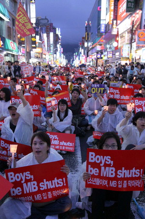 부산 촛불집회도 종교인 가세 -부산일보 광우병 부산시국회의 "5일부터 대거 참석" 장맛비가 내린 2일 오후 부산 서면 쥬디스태화 앞에서 미국산 쇠고기 수입 재협상 촉구 촛불집회가 열렸다. 강원태 기자 종교계의 동참으로 힘을 얻은 미국산 쇠고기 반대 촛불집회가 민주노총 총파업에 따른 노조원들의 합류로 새로운 전기를 맞고 있다. 천주교 정의구현 전국사제단(이하 사제단)의 시국미사 사흘째인 2일 서울 도심에서 진행된 미국산 쇠고기 수입 반대 '촛불 거리행진'이 별다른 마찰 없이 평화롭게 마무리됐다. 서울광장에서 이날 저녁 열린 시국미사와 뒤이은 거리행진에는 총파업에 돌입한 민주노총 조합원 3천500여명(경찰 추산·주최 측 추산 5천여 명)이 합류했으나 사제단의 참가 이후 계속된 비폭력·평화시위 기조에는 변함이 없었다. 이날 오후 7시 부산 서면 쥬디스태화 앞에서는 2천여 명(경찰 추산 1천500명)의 시민들이 참가한 가운데 근래 최대 규모의 촛불집회를 열었다. 이날 촛불집회에는 부산역광장에서 파업 결의대회를 마친 민주노총 노조원 1천200명(경찰 추산 1천명)이 대거 합류, 장대비 속에서도 대규모 촛불 행렬을 이어나갔다. 광우병 부산시국회의 최지웅 정책팀장은 "오는 5일 부산지역에서도 종교인들이 대거 참석키로 했으며 3일 오후에는 촛불집회 참여 외 다른 방식의 참여를 논의하기 위해 부산지역 종교인들이 모이기로 하는 등 부산에서도 종교계가 촛불집회에 적극 힘을 실어주고 있다"고 밝혔다.