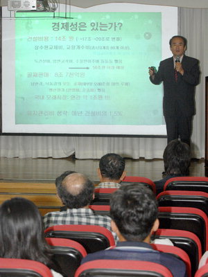 "운하 경제성·치수효과 의문 … 재원 인재육성에 써야" -국제신문 운하반대전국교수모임 '낙동강 미래' 강연회 수질오염총량제 확대 보완 등 보전정책 주문 부·울교수 114명 참여 개발 반대 모임도 발족 운하반대전국교수모임이 지난달 30일 개최한 국민초청대강연회에서 서울대 김정욱 교수가 '한반도대운하를 넘어'란 주제로 강연하고 있다. 서정빈 인턴기자 지난달 19일 이명박 대통령이 "국민이 반대하면 대운하를 추진하지 않겠다"고 밝히면서 그동안 국민적 논란의 대상이 됐던 대운하 건설사업이 사실상 중단됐다. 그럼에도 불구하고 낙동강과 접한 광역자치단체 중에서는 재해예방을 위한 치수 문제를 들어 하천 정비사업을 추진하고 있다. 이들은 "낙동강 치수를 위해 운하는 반드시 필요하다"고 말하고 있다. 하지만 '한반도대운하를 반대하는 전국교수모임(운하반대전국교수모임)'에서는 운하는 치수의 방법이 될 수 없으며 이는 주민을 우롱하는 일이라고 밝히고 있다. 또 운하로 인한 지역개발의 실제 효과는 오로지 '땅값 상승'뿐이라고 말한다. 지난달 30일 운하반대전국교수모임은 부산에서 '운하중단 이후 낙동강의 미래'를 주제로 국민초청 대강연회를 열었다. 강연에서는 운하건설의 문제점 지적과 더불어 치수문제의 대안, 운하중단 이후의 지역발전 방안, 4대강 보전의 정책적 대안 등 낙동강과 지역사회의 지속가능한 발전을 위한 과제와 대안들이 제기됐다. 이에 앞서 '운하와 다음을 생각하는 부산울산교수모임'이 부산시의회에서 기자회견을 갖고 발족을 선언했다. 운하반대 부울교수모임 발족 부산·울산지역 대학 교수 114명이 참여한 부·울교수모임은 기자회견에서 "낙동강을 막는 어떤 개발에도 단호히 반대한다"며 "낙동강의 수질과 영남권 지역개발 문제 등에 대해 과학적이고 객관적인 사실을 전달할 것"이라고 말했다. 이들은 회견문에서 "이명박 대통령이 '국민이 반대하면'이라는 조건을 달고 대운하 추진 중단을 밝혔지만 낙동강 유역 5개 시도지사 등이 계속 추진을 요구하고 있다"면서 "정부가 운하에 대해 완전히 포기했다고 보기 어렵고 향후 4대강 정비사업 등의 형태로 부활할 가능성을 배제할 수 없다"고 주장했다. 교수모임은 개발중심적 운하건설의 대안으로 운하를 넘어선 친환경적 정비방안과 대안적 지역개발 방안을 제시하고 향후 운하가 다른 모습으로 부활하지 않도록 감시의 끈을 놓지 않겠다고 밝혔다. 또 교수모임은 운하가 가져올 생태적 환경적 영향에 대한 연구결과를 조만간 심포지엄 형태로 발표할 계획이다. "운하를 넘어서 대안은 있다" '한반도 대운하를 넘어-한반도 대운하 구상의 허구성과 향후 과제'를 주제로 한 국민초청 대강연회의 기조강연에서 서울대 김정욱(환경대학원) 교수는 물동량 흡수, 물류비 절감, 운송시간, 건설비 등 운하의 경제성에 대해 문제제기를 하고 추진방법의 부당성에 대해서도 지적했다. 그는 "재생에너지에 기반한 에너지체계 개발 등으로 지속가능한 지역사회를 만들고 이와 더불어 지속가능한 물관리 정책 마련에 노력을 집중해야 한다"며 이를 위해 전문인력 확보에 투자할 것을 주문했다. 이어 서울대 최영찬(농경제사회학부) 교수는 '낙동강 운하중단과 지역발전' 강연에서 이 대통령의 '국민이 반대하면'이란 말은 사실 '국민이 반대해서'가 되어야 한다며 운하의 재추진 가능성이 농후하다고 말했다. 그는 운하의 경제적 효과는 기대하기 어렵고 동남권의 경제적 여건을 분석하며 발전을 위한 대안을 제시했다. 그는 "동남권 경제 발전을 위해서는 지역대학 지원을 통한 인적자원 개발과 연구개발 강화가 필요하다"며 "대운하에 소요될 재원을 인력양성과 산업용지 공급 등에 투입한다면 운하 이상의 경제적 발전이 가능하다"고 밝혔다. "임기 내 개발 대신 보존 정책을" 인제대 박재현(토목공학과) 교수는 이어진 '대안적 낙동강 수자원관리 방안' 강연에서 "지자체가 운하 건설의 당위성으로 내세우는 게 홍수 등을 대비한 치수 문제지만 실제 운하는 효과적인 치수수단이 될 수 없다"며 "지자체는 운하로 치수문제가 해결될 것이라는 환상을 버려야 할 것"이라고 말했다. 그는 단기적으로 운하가 통수단면(하천에서 물이 흘러갈 수 있는 단면적) 부족 문제를 해결할 수는 있지만 급류 산사태 침수 등 태풍이나 홍수에 의한 피해를 막는 것은 운하건설로는 불가능하다고 밝혔다. 그는 대안으로 강변 저류지를 확대한 형태인 바이패스(bypass·홍수방어용 전환수로)를 만들어 상류의 수량을 하류로 분산할 것을 제시했다. 마지막으로 강연에 나선 부산가톨릭대 김좌관(환경공학과) 교수는 '4대강 아쿠아 르네상스 정책 대안'에서 이명박 대통령이 임기가 끝나는 2012년을 목표로 4대강 보전정책을 추진해 달라고 주문했다. 그는 맑은 강물 만들기를 위해 하수처리장을 증설하고 인공습지나 유수지 설치로 비점오염원(빗물에 쓸려 하천으로 들어가는 오염물질) 관리에 나설 것을 요구했다. 또 친환경적이고 홍수피해를 줄일 수 있는 자연형 하천 만들기에 2012년까지 1조 원을 투자하고 낙동강 영산강 금강 등 3대강의 하구둑을 상시