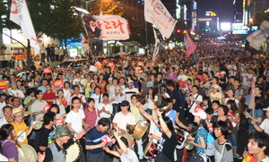 [부산 촛불] 기말고사 끝낸 학생·유모차 부대 재등장 -국제신문 쇠고기 불매운동 등 '생활 촛불' 병행키로 집회는 매주 수·토요일만 실시 '숨고르기' 5일 부산 서면 쥬디스태화 앞에서 열린 촛불집회에서 참가자들이 왕복 8차로 도로를 점거한 채 흥겹게 문화제 행사를 진행하고 있다. 이재찬 기자 '6·10 촛불대행진' 이후 최대 인파가 모인 '7·5 국민승리선언 범국민 촛불대행진'이 전국 53만여 명(주최 측 추산, 경찰 추산 6만8천여 명)이 참가한 가운데 평화적으로 마무리됐다. 5일 오후 7시 부산 서면 쥬디스태화 앞에서 8천여 명(경찰 추산 3천여 명)의 시민이 모여 촛불을 들었으며 주최 측은 이날 재확인한 촛불 동력에 힘입어 앞으로 '거리 촛불'에 더해 유통 저지, 불매운동 등 '생활 촛불' 운동을 병행해 나간다는 계획이다. 참가자들은 쥬디스태화 옆 도로의 파리바게뜨~부산은행 구간을 가득 채웠으며 기말고사를 끝낸 중·고등학생들이 대거 참가했다. 그동안 사라졌던 유모차 부대도 다시 등장했다. 한편 광우병 부산시국회의(이하 부산시국회의) 최지웅 정책팀장은 이날 촛불 동력을 재확인한 데 대해 만족감을 나타내고 "쇠고기 재협상 촉구 기조는 그대로 유지하되 소비자단체와 함께 광우병 쇠고기 유통 저지 및 불매운동을 전개해 촛불 운동을 생활 속으로 확장시켜 나갈 계획"이라고 7일 밝혔다. 이 외에도 부산시국회의는 단조로운 방식의 '거리 촛불'에서 벗어나 다양한 방식의 생활 촛불 운동을 전개할 계획이다. 또 이번 주부터는 촛불집회를 매주 수요일과 토요일에만 실시, 숨 고르기와 함께 촛불 동력을 집중시킨다는 계획이다.