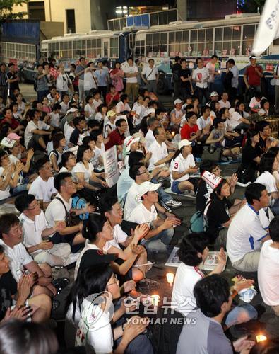 <비폭력 기조 유지한 한밤의 `촛불축제'> -연합뉴스 전경 버스 배경 삼아 문화 행사 즐기는 시민들 (서울=연합뉴스) 이상학 기자 =5일 오후 서울시청 앞 광장에서 열린 미국산 쇠고기 수입반대 촛불집회에 참가한 시민들이 거리 행진을 마친 뒤 문화 공연 등을 진행하고 있다. leesh@yna.co.kr (끝) / 이상학 `인간방패' 출현..경찰도 시위대 자극 자제 (서울=연합뉴스) 사건 팀 = `6.10 100만 촛불 대행진' 이후 최대 인파가 몰린 5일 저녁부터 6일 새벽 사이 `국민 승리 선언을 위한 촛불문화제'는 평화롭고 흥겨운 축제 분위기 속에서 진행됐다. 비폭력 기조를 유지하려는 주최 측과 참여단체, 시민들의 노력이 돋보인 가운데 경찰도 청와대로 통하는 주요 진입로를 차단했을 뿐 시위대를 자극하는 행동은 철저히 자제하는 모습을 보였다. ◇ 정치·종교·시민단체 대표들의 `인간방패' = 주최 측인 광우병 국민대책회의는 이번 주 들어 종교단체가 전면에 나선 것을 계기로 어렵게 되찾은 비폭력 기조를 유지하기 위해 다분히 전략적인 방식을 택했다. 이날 밤 집회에 동참한 국회의원 등 정치인과 4개 종단을 대표하는 성직자, 시민단체 대표ㆍ활동가와 YMCAㆍ한국청년연합회(KYC) 활동가 그룹에 시위대와 경찰 간의 충돌을 막는 `인간방패'의 역할을 당부한 것. 실제로 시청광장∼남대문∼명동∼종로∼안국역∼종로3가∼세종로 등으로 이어진 거리시위에서 이들은 시위대 전후좌우에 배치돼 시위대-경찰 간의 충돌을 방지하는 역할을 톡톡히 해냈다. 민주당 등 야당의원 40여명은 종각역에서 세종로 방향으로 행진하던 수천 명 규모의 시위대가 교보문고 앞에서 전경버스로 이뤄진 경찰 차벽에 다가서려 하자 차벽 앞쪽으로 나아가 `인간띠'를 형성, 저지하기도 했다. 또 `비폭력평화협동단'이라는 글씨가 새겨진 녹색 조끼를 입은 100여명의 참가자들은 집회 내내 서울시의회 앞에 설치된 차벽 앞에서 열을 지어 앉아 차벽과 시위대 사이에 `완충지대'를 형성했다. 포털 사이트 다음의 `nonviolence2008' 카페 회원들이라고 밝힌 이들은 "촛불집회가 과격해지다 보니 처음 취지가 잊혀진 측면이 있다"며 "촛불집회는 철저히 비폭력적으로 진행돼야 한다"고 강조했다. 일부 시위 참가자가 전경버스에 페인트로 낙서를 하거나 전경버스 바퀴 바람을 빼려 하자 이를 강하게 만류하는 모습도 자주 목격됐다. ◇ 비폭력 속에 진행된 `촛불축제' = 비폭력 기조 덕분에 이날 집회에서는 이색적인 퍼포먼스와 문화행사가 밤새도록 이어지는 등 축제라고 부를 정도로 즐겁고 흥겨운 장면이 연출됐다. 한미자유무역협정에 반대하기 위해 관광버스 2대에 나눠 타고 상경한 전국농민회총연합회 회원 80여명은 1t 트럭 3대 분량의 수박과 토마토, 오이를 가져와 프라자 호텔 앞에서 시위 참가자들에게 나눠줘 큰 호응을 얻었다. 다음 아고라 회원들은 시청 본관 앞에서 '보수 언론에 광고를 내지 않는 삼양라면을 돕자'는 취지로 `삼양산성 쌓기 행사'를 진행하는 바람에 광화문과 태평로, 시청 주변 슈퍼마켓의 모든 삼양라면이 동나는 진풍경도 벌어졌다. 검은 망토와 모자, 하얀 마스크를 착용한 인터넷 DVD동호회 소속 회원 100여명은 시위 행렬이 한국은행 분수대 앞을 지날 때 분수대 위에 일렬로 도열, 수백 발의 폭죽을 쏘아 올려 열렬한 환호를 받았다. 행진 이후에는 촛불문화제 2부 행사가 이어진 가운데 수백 명의 시민들이 참여하는 사물놀이, 악기 퍼포먼스 등이 곳곳에서 벌어졌고 삼삼오오 모여 앉아 술잔을 기울이며 이야기꽃을 피우는 장면들도 연출됐다. 주말인 탓인지 1∼2살짜리 아기를 유모차에 태워 데리고 나온 주부, 초등학생 아이의 손을 잡고 나온 부부 등 가족단위 참가자들도 눈에 띄게 늘었다. ◇ 박노자 교수 "너무 평화롭다" = 귀화 한국인인 박노자(35) 노르웨이 오슬로대 한국학과 교수는 서울광장에서 촛불집회를 지켜보면서 "이런 아름다운 집회는 처음 본다"며 감탄했다. 노르웨이에서 3일 일시 귀국한 그는 "평화로워서 너무나 좋고 기쁘다"며 "정치적 문제를 이런 분위기로 다룰 수 있다는 건 매우 선진적이며 국민의 정신건강에도 좋을 일"이라고 말했다. 박 교수는 미국산 쇠고기 수입과 관련, "(버락) 오바마 미국 민주당 대선후보도 대통령이 되면 한미자유무역협정(FTA)을 `재협상'한다고 하고 있는 만큼 미국산 쇠고기 재협상도 결국은 외교력의 문제"라며 "한국의 대통령이 미국에 너무 저자세로 임하는 것 같다"는 견해를 보였다. 박 교수는 `당신들의 대한민국' 등 저서를 통해 한국 사회를 거침없이 비판하면서 유명세를 탄 인물로 올해 초 진보신당의 창당발기인 명부에 이름을 올리기도 했다. 한편 촛불집회와 관련한 인권침해 상황을 조사하러 방한한 노마 강 무이코(41.여) 국제앰네스티 조사관은 전날에 이어 5일 저녁에도 서울광장 일대에서 촛불집회를 지켜봤다.