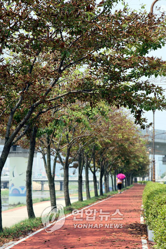<탄성고무 포장길 옆 벚나무 집단고사> -연합뉴스 고사되고 있는 벚나무 (김천=연합뉴스) 손대성 기자 = 6일 경북 김천시 신음동 직지천 강변도로 옆에 심어져 있는 벚나무가 잎이 갈색으로 변하고 떨어지는 등 고사되고 있다. 김천시는 5월 중순께 이 일대 산책로를 시민들의 체력소모를 줄일 수 있도록 푹신푹신한 탄성고무로 교체한 뒤 벚나무 고사 현상이 발생한 점에 주목하고 있다. << 전국부 기사 참조 >> sds123@yna.co.kr 상주.김천서 잇따라 발생..원인 불분명 (김천.상주=연합뉴스) 손대성 기자 = 경북 김천과 상주지역에서 멀쩡했던 벚나무가 말라 죽어가는 현상이 나타나고 있다. 이 같은 현상은 벚나무 인근의 산책로나 자전거도로가 우레탄 성분의 탄성고무 재질로 교체된 뒤 발생해 연관성에 이목이 집중되고 있다. 6일 김천시에 따르면 6월 초부터 김천시 신음동 교동교에서 주공 그린빌아파트 앞까지 이어지는 강변도로 옆에 심어져 있는 벚나무 200여 그루가 갑자기 시들시들해졌다. 초여름임에도 불구하고 잎이 갈색으로 변하고 심지어 잎이 땅으로 떨어지는 등 가을에나 볼 수 있는 현상이 빚어졌다. 김천시는 부랴부랴 한국나무병원에 원인 진단을 의뢰한 결과 산책로의 포장 사업으로 인한 피해로 추정된다는 답변을 받았다. 시는 5월 중순께 이 일대 산책로를 시민들의 체력소모를 줄일 수 있도록 푹신푹신한 탄성고무로 교체한 바 있다. 특별히 나무가 시들해질 이유가 없다는 점에서 포장에 쓰인 화학물질이 땅 속에 스며들어 벚나무에 악영향을 미쳤다고밖에 볼 수 없는 셈이지만 추정만 될 뿐 아직 정확한 원인은 밝혀지지 않았다. 이에 따라 김천시는 6회에 걸쳐 식물 영양제를 살포하고 뿌리에 물을 주는 등 우선 나무를 되살리기 위해 안간힘을 쓰고 있다. 김천시 관계자는 "포장에 쓰인 탄성고무 등에서 나온 유해물질과 다른 유해물질이 결합되면서 발생한 복합적 현상이라고 본다"며 "나무 상태에 따라 적절한 조치를 취해 수세 회복을 위해 노력하겠다"고 말했다. 인근 상주에서도 이와 비슷한 현상이 나타나 상주시도 골머리를 앓았다. 상주시에 따르면 작년 7월 초 상주시 무양동 북천교부터 계림동 상산교까지 1㎞에 이르는 북천 둑을 따라 조성된 자전거 도로변의 벚나무 300여 그루가 잎이 갈색으로 변하고 말라 죽는 현상이 빚어졌다. 벚나무 고사 현상은 김천에서와 마찬가지로 2006년 10월 상주시가 자전거도로를 탄성고무로 설치한 뒤에 발생해 공사과정에서 사용된 화학물질과 연관이 있는 것 아니냐는 의혹을 샀다. 상주시는 경북도산림환경연구소와 서울 산림과학원, 강원대 산림자원학과 등에 원인 분석을 의뢰했으나 확답을 받지 못한 채 우레탄과 바이러스의 복합적 영향이라고 잠정 결론을 내렸다. 상주시도 영양제를 투여하거나 황토를 뿌리는 등 응급조치를 벌였으나 피해를 본 벚나무가 올해 꽃이 피지 않은 채 바로 잎이 나는 등 여파가 이어지고 있다. 상주시 관계자는 "정확한 원인을 밝혀내지 못했으며 응급조치로 수세가 상당히 좋아져 내년에는 정상적으로 꽃을 피울 수 있을 것으로 기대하고 있다"고 말했다.