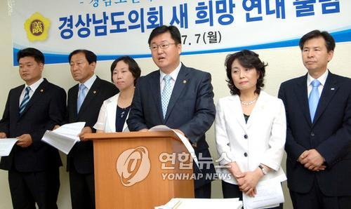 <경남도의회에 '야3당+무소속' 교섭단체 탄생> -연합뉴스 (창원=연합뉴스) 정학구 기자 = 경남도의회 비(非)한나라당 의원 7명이 한나라당 독주를 견제하기 위해 교섭단체 구성에 합의하고 7일 '새희망연대'를 출범했다. <<지방기사 참조, 도의회 제공>> (창원=연합뉴스) 정학구 기자 = 경남도의회에서 정당이 서로 다른 소수파 의원 7명이 교섭단체를 구성했다. 경남도의회 무소속 김해연(거제2) 의원과 민주당 명희진(김해4) 의원 등 비한나라당 도의원 7명은 7일 도의회에서 가진 기자회견에서 교섭단체 '새희망연대' 발족을 선언한 후 의회 사무처에 공식 등록했다. 김 의원을 대표로 하고 명 의원이 간사로 선임된 이 교섭단체에는 이은지(여. 민주 비례대표), 김미영(여. 민주노동당 비례대표), 손석형(민노. 창원4), 문정섭(무소속. 함양1), 김제휴( ". 거창2) 의원 등이 참여했다. 민주당 2명, 민주노동당 2명, 무소속 3명 등 비한나라당 소속 도의원이 원내 절대다수를 차지하고 있는 한나라당(43명) 의원들의 독주를 견제하겠다며 나선 것이다. 이 교섭단체의 대표인 김 의원은 진보신당 입당을 전제로 민노당을 탈당한 상태여서 사실상 무소속과 3개 정당 연합인 셈이다. 현재 전국의 광역의회 가운데 서울시와 경기.전북.제주도 의회 등에 한나라당과 민주당 등 단일정당 소속 의원들이 교섭단체를 구성했지만 이처럼 여러 정당이 단일 교섭단체를 구성한 사례는 없다. 김 대표는 이날 "의회 내 건전한 야당세력을 형성해 한나라당의 일방통행을 저지하면서 집행부도 견제하겠다"며 "도민들, 특히 힘없는 소수의 목소리도 적극 수렴해 도정에 반영되도록 하겠다"고 말했다. 민주당 이 의원은 "당과 특별히 조율을 하진 않았지만 상식선에서 도민의 입장을 대변하고 권익을 보호하는데 힘을 합치기로 의견을 모았다"며 "그동안 혼자나 2-3명으로는 힘들었던 일들도 교섭단체의 이름으로 일해 나가면 도민들이 더 관심을 가져줄 것으로 본다"고 밝혔다. 이에 대해 최근 후반기 의장으로 선출된 한나라당 이태일(마산4) 의원은 "의회 내 소수파 의견에도 귀를 기울이고 취사선택은 하겠지만 최대한 반영하겠다"며 "당원협의회 상태인 한나라당도 조만간 교섭단체를 구성할 예정이다"고 말했다.