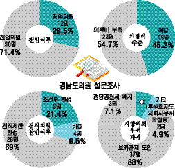 도의원 겸업보다 전업 많다 -경남신문 53명 중 42명 설문 응답…71% 차지 “현 의정비 부족… 생활비 포함돼야” 경남도의원들은 의정활동만 하는 전업의원이 30명(71.4%)으로 겸업의원 12명(28.5%)보다 훨씬 많은 것으로 조사됐다. 때문에 시민단체들이 지방의회 의정비 인상에 대해 반대하는 것과 달리 전업의원이 많은 경남도의원들은 현 의정비가 턱없이 부족하다고 생각하고 있는 것으로 조사돼 양측의 괴리가 큰 것으로 나타났다. 경남신문이 도의원 53명을 대상으로 설문조사를 실시한 결과, 42명이 설문에 응해 현 의정비 수준(2008년 4920만원, 2009년 5162만원)에 대해서는 부족하다는 의원이 23명(54.7%), 적당하다는 의원이 19명(45.2%)으로 부족하다는 의견이 약간 높았다. 의정비가 부족한 이유에 대해 선거법에 제한돼 있기는 하지만 지역구 활동과 경조사비, 교통비, 사무실 운영비 등에 많은 경비가 들어가기 때문이라고 응답했다. 적당하다는 이유에 대해서는 경제상황을 감안하거나 주어진 여건에 맞춰 의정비를 사용해야 하기 때문이다고 밝혔다. 행정안전부가 유급제에 따라 국회의원 보좌·비서관, 새마을금고 상금 임직원 등 일부 직종에 대한 겸직제한에 대해서는 29명(69%)이 찬성했고, 9명(21.4%)은 조건부 찬성, 4명(9.5%)은 반대의사를 나타냈다. 겸직여부에 대해 조건부로 찬성하거나 반대한 의원들은 겸직을 할 수 없게 하려면 현 의정비로 전업의원을 하기에는 현실적으로 턱없이 적어, 전업의원으로서 충실하게 의정활동과 가정생활이 영위될 수 있도록 의정비인상 등 안전장치를 마련해야 한다는 의견을 밝혔다. 또 전업 의정활동을 하기 위해서는 의정비에 생활비 개념이 포함돼야 한다는 의견 다수를 차지했다. 조사에서는 의원 가운데 11명(26.1%)은 의정비를 의정활동 외에 일부 생활비로도 사용하고 있는 것으로 나타났다. 도의원들은 지방의원들의 의정활동에 가장 시급한 것은 37명(88%)이 보좌관제 도입을 손꼽았고, 다음으로 3명(7.1%)이 지방의원의 정당공천제가 폐지돼야 한다고 생각했다. 의원들은 보좌관제가 도입된다면 의정비 인상을 하지 않아도 된다는 의견도 제시했고, 국회의원들만 할 수 있는 후원회제도 도입과 의회 직원의 인사권독립(의회 사무처 독립), 집행부 감사기능 의회이전, 의정활동보고서와 인쇄비 등 의정활동에 따른 우편발송료 등도 예산에 반영돼야 한다고 의견을 제시했다.